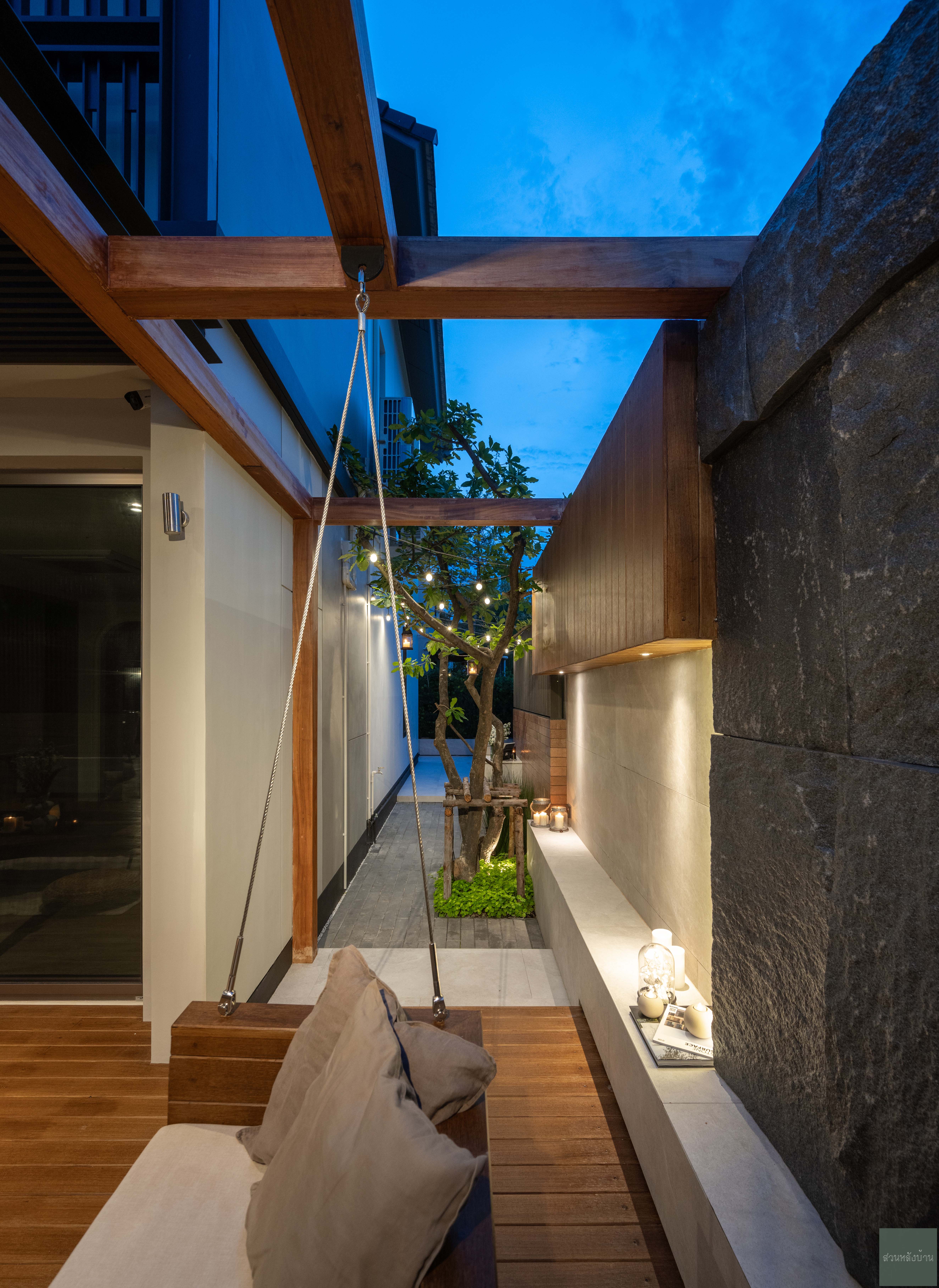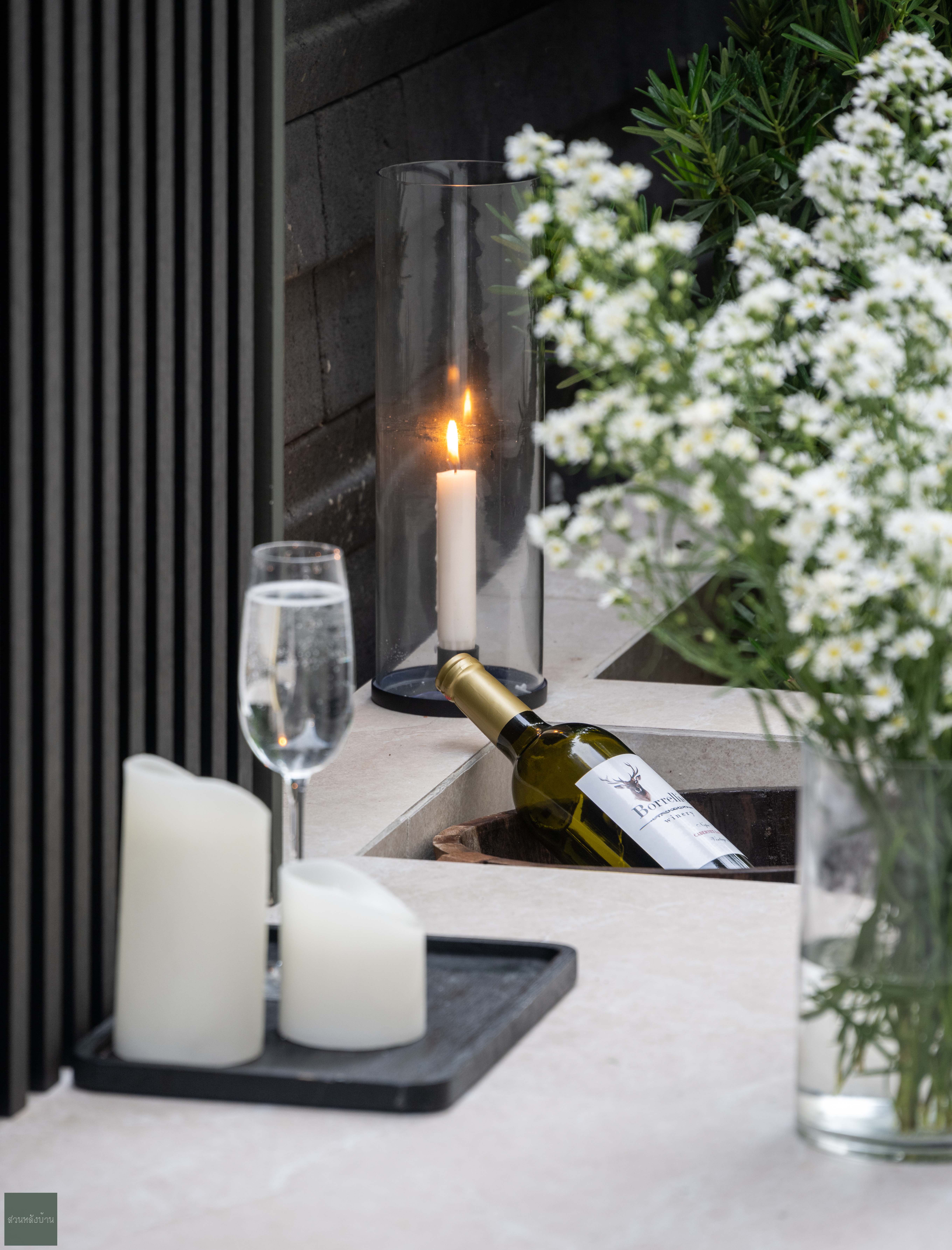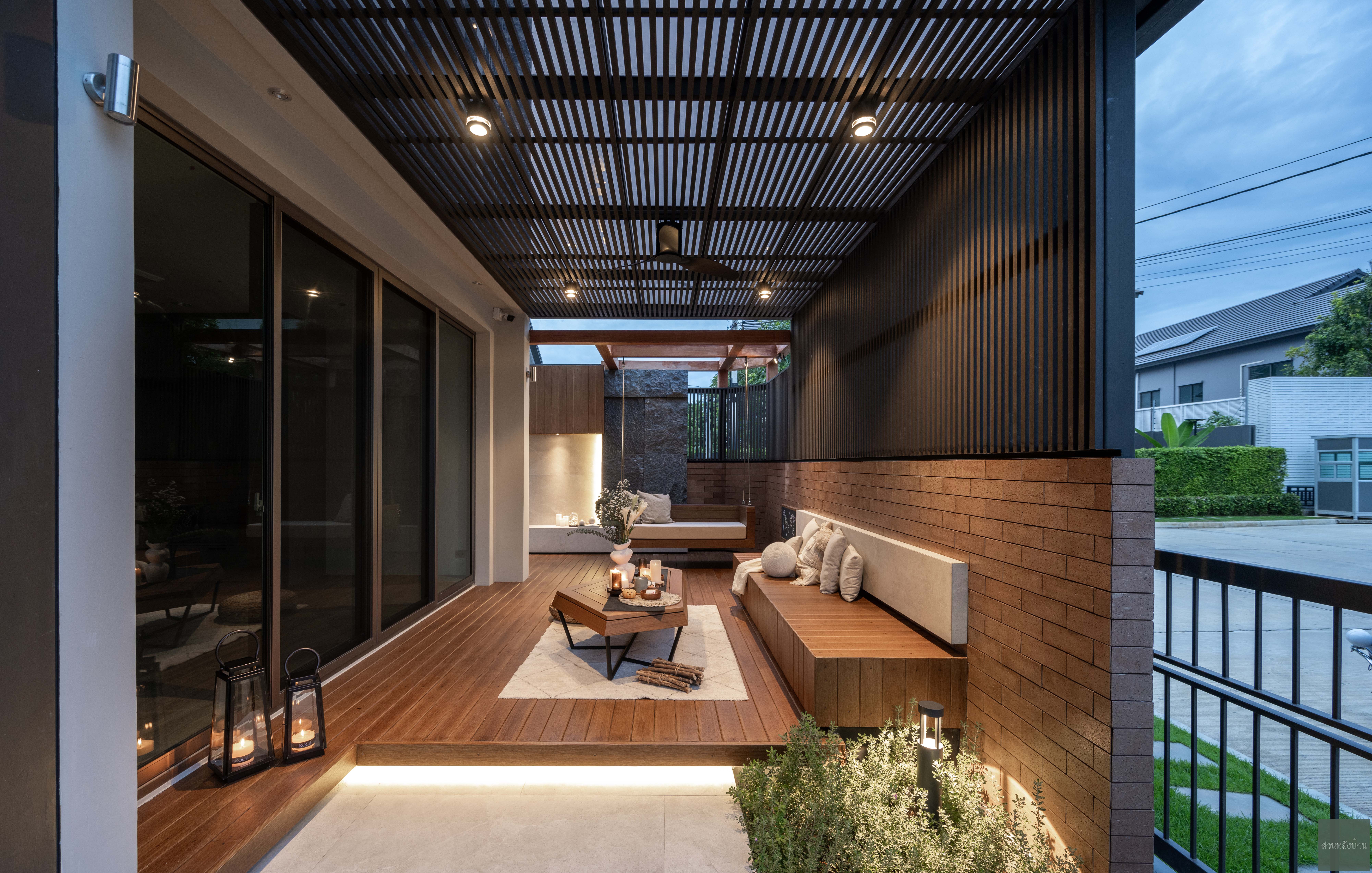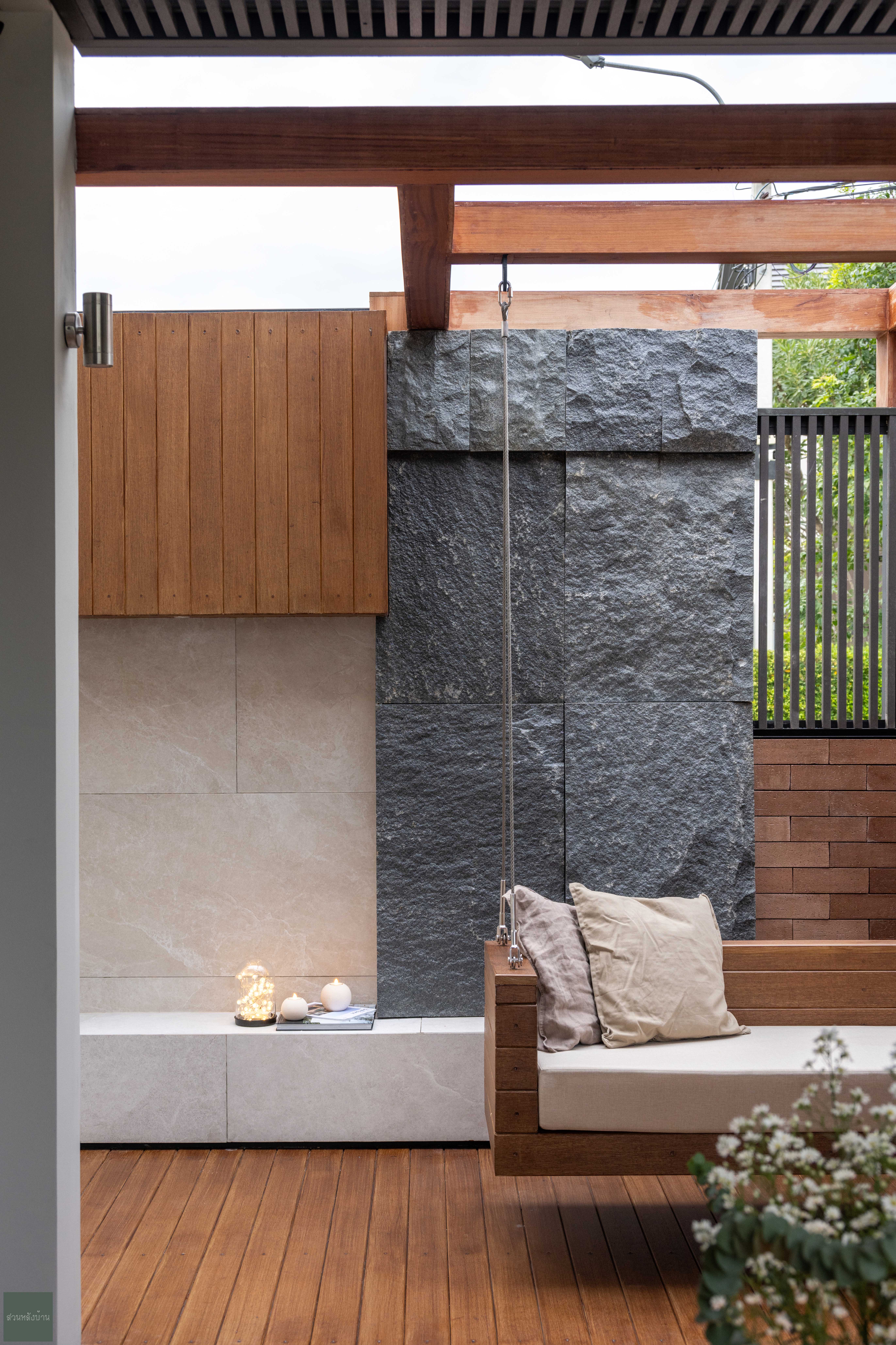ส่วนหลังบ้าน เราไม่ปล่อยให้เป็นเพียงพื้นที่ว่าง เราเติมผนังบังสายตาเข้าไปเพื่อเปิดมุมมองจากห้องรับประทานอาคาร สามารถมองออกมาและยังคงเป็นส่วนตัวจากเพื่อนบ้าน เนื่องจากระยะหลังบ้านค่อนข้างกระชั้น ส่วนด้านล่างของผนังตกแต่ง เราทำเป็นม้านั่ง ที่เป็นกะบะต้นไม้ได้ รวมถึงช่องserviceที่อยู่ตรงม้านั่ง เราเติมฟังก์ชั่นของถังแชร์ไวน์เอาไว้ด้านบน เพื่อความสวยงามเวลามอง