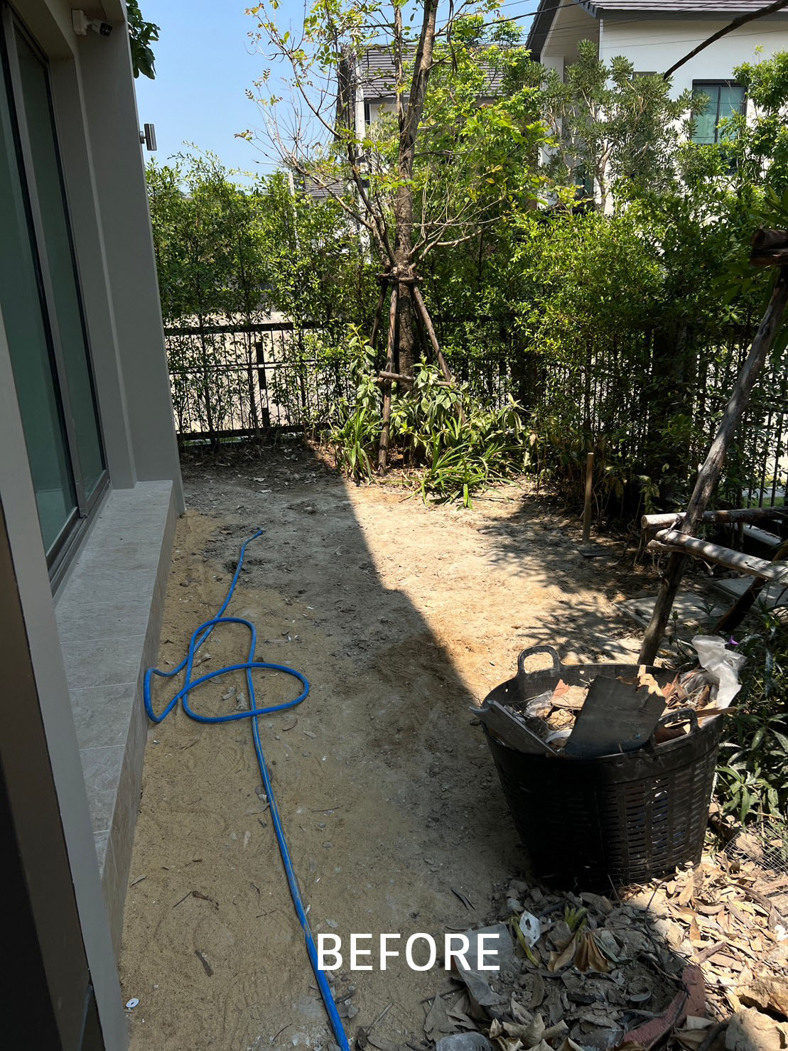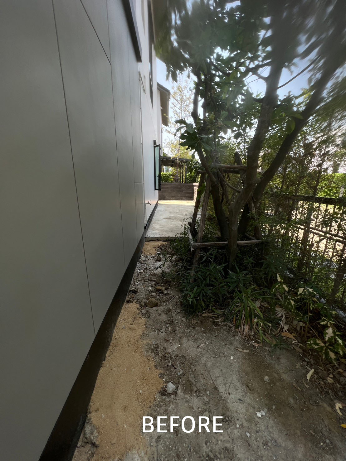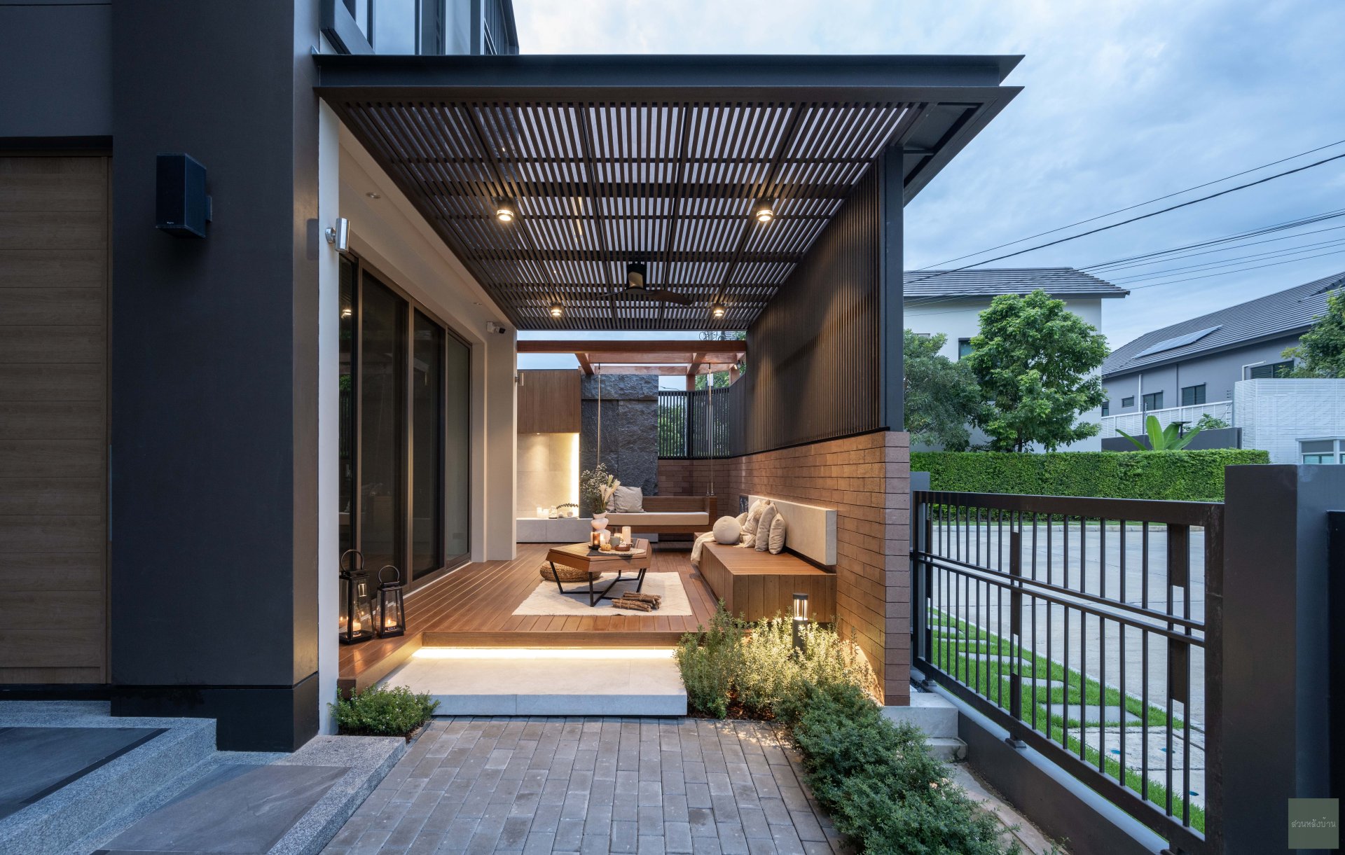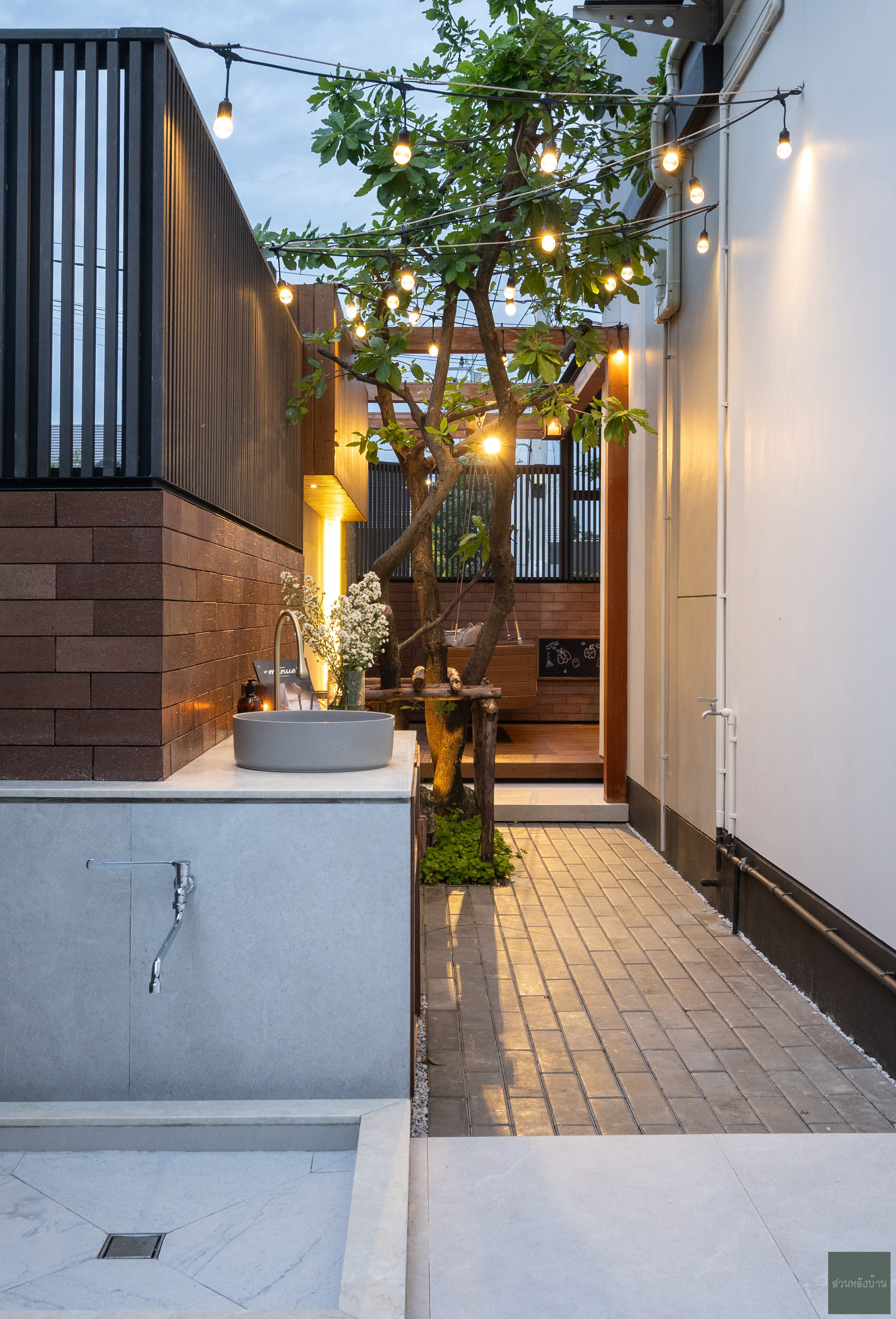 ส่วนหลังบ้าน เราไม่ปล่อยให้เป็นเพียงพื้นที่ว่าง เราเติมผนังบังสายตาเข้าไปเพื่อเปิดมุมมองจากห้องรับประทานอาคาร สามารถมองออกมาและยังคงเป็นส่วนตัวจากเพื่อนบ้าน เนื่องจากระยะหลังบ้านค่อนข้างกระชั้น ส่วนด้านล่างของผนังตกแต่ง เราทำเป็นม้านั่ง ที่เป็นกะบะต้นไม้ได้ รวมถึงช่องserviceที่อยู่ตรงม้านั่ง เราเติมฟังก์ชั่นของถังแชร์ไวน์เอาไว้ด้านบน เพื่อความสวยงามเวลามอง