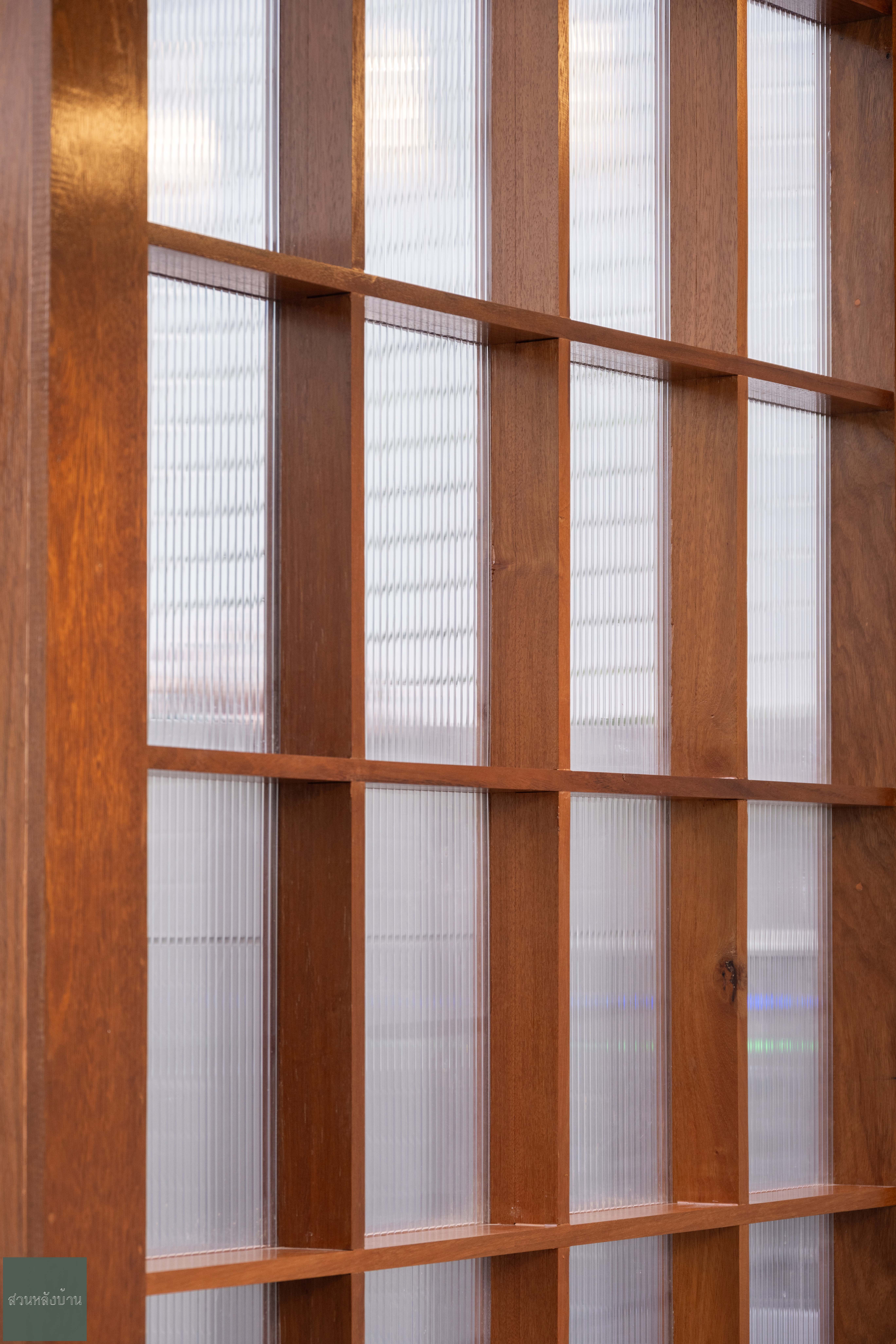 ในส่วนมุมที่อาจเป็นมุมมองไปทางส่วนเซอวิสหรือมุมที่อาจไม่น่ามอง เราใช้ฉากโปร่งแสงที่มีลอนลูกฟูกเป็นฉากกั้น เพื่อเบลอภาพมุมมองที่จะเห็นในส่วนไม่เรียบร้อย แต่ยังสามารถให้แสงธรรมชาติรอดผ่านได้ รวมถึงไม่ปิดกั้นมุมมองเมื่อมีผู้ใช้งานอยู่อีกฝั่งของฉากนี้ ทำให้ไม่เกิดจุดอับสายตาในบริเวณสวน
