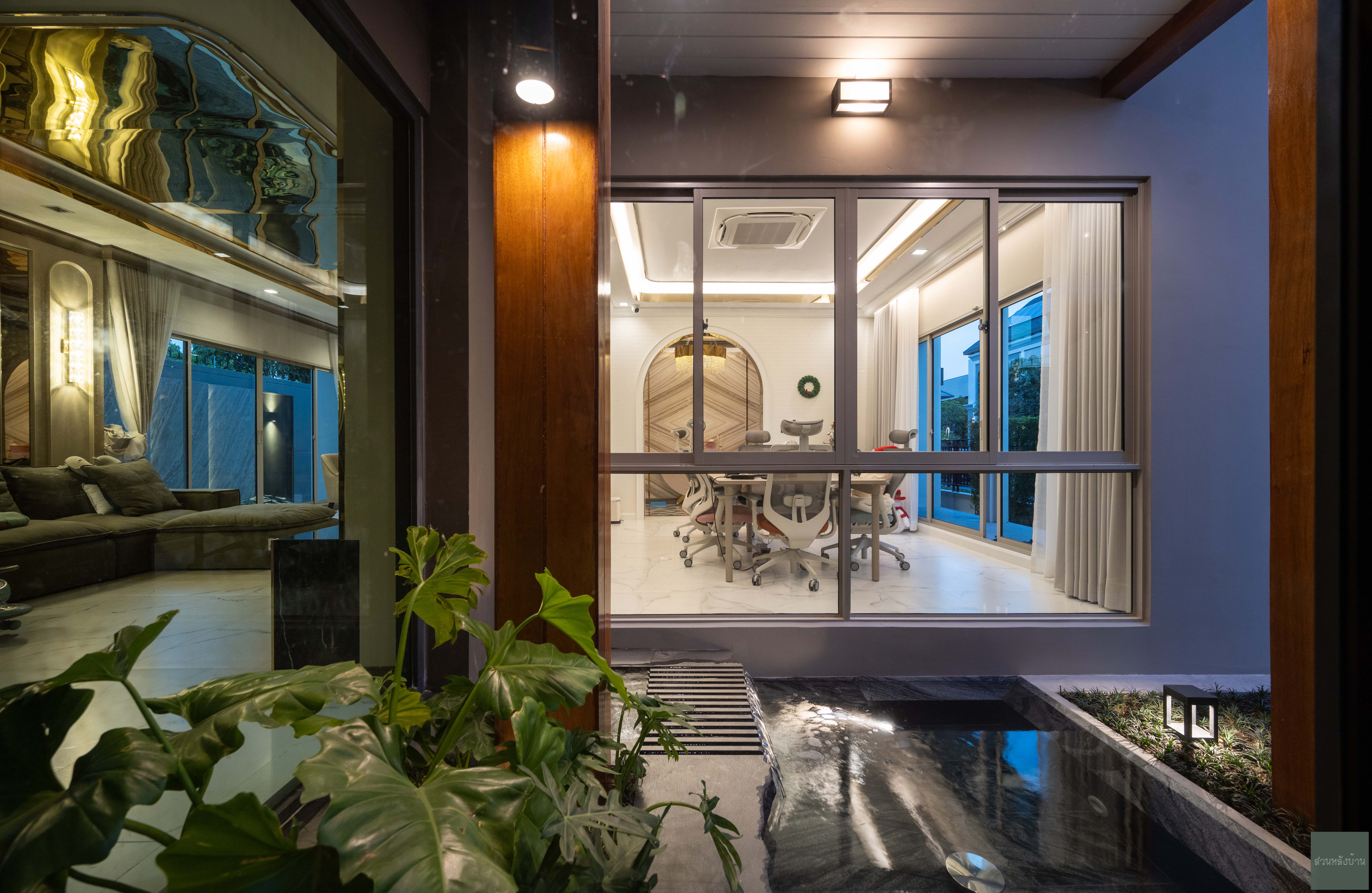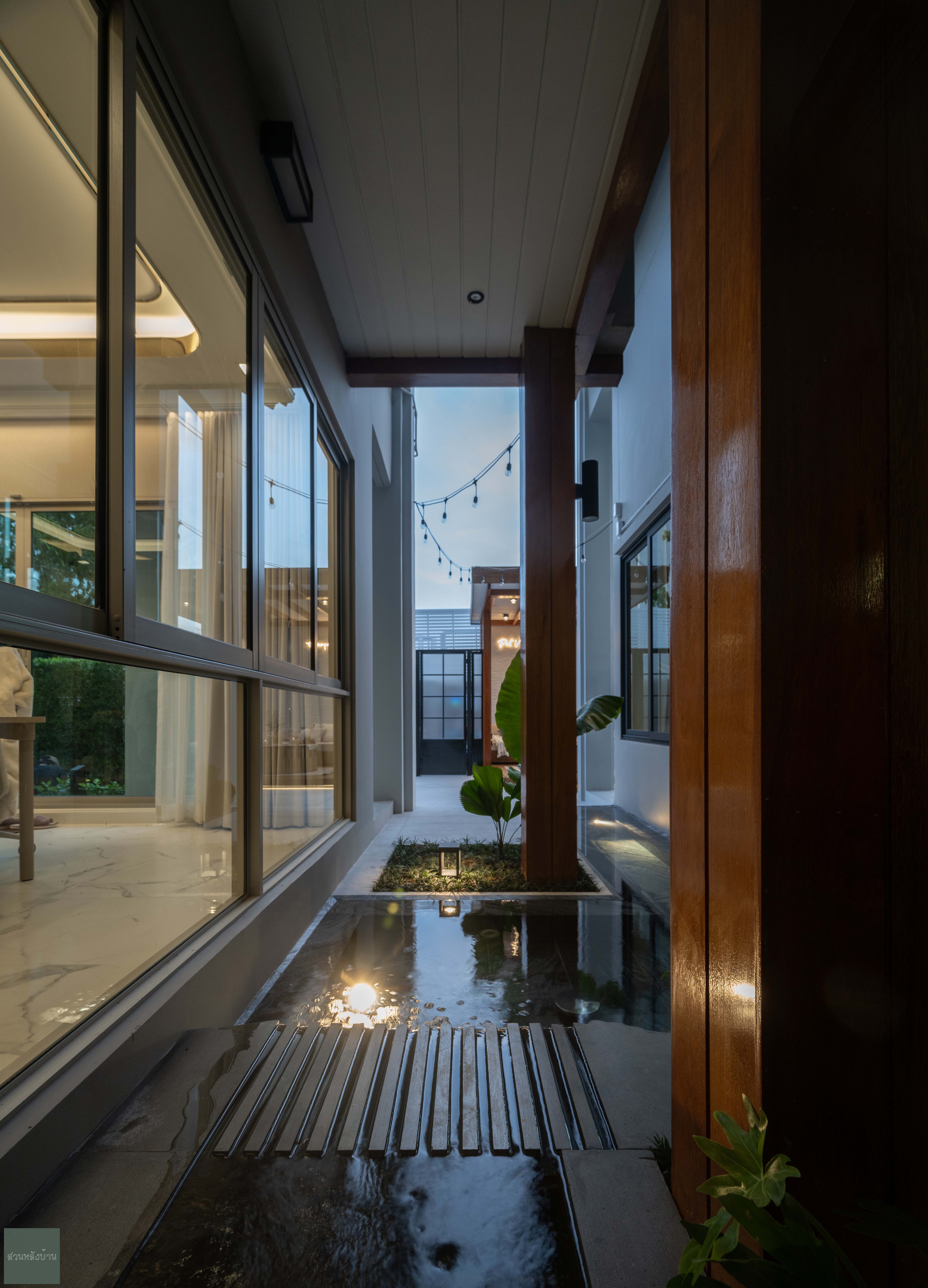 ระหว่างอาคารที่ถูกต่อเติมออกมานั่ง มีช่องว่างที่ เจ้าของบ้านต้องการให้เป็นพื้นที่ศูนย์กลางที่มีบ่อน้ำและเสียงน้ำตก เชื่อมต่อคนในบ้าน เข้าด้วยกัน ไม่ว่าจะอยู่ที่ห้องไหนก็สามารถได้ยินและเข้าถึงกันได้ด้วยเสียงของธรรมชาติ
