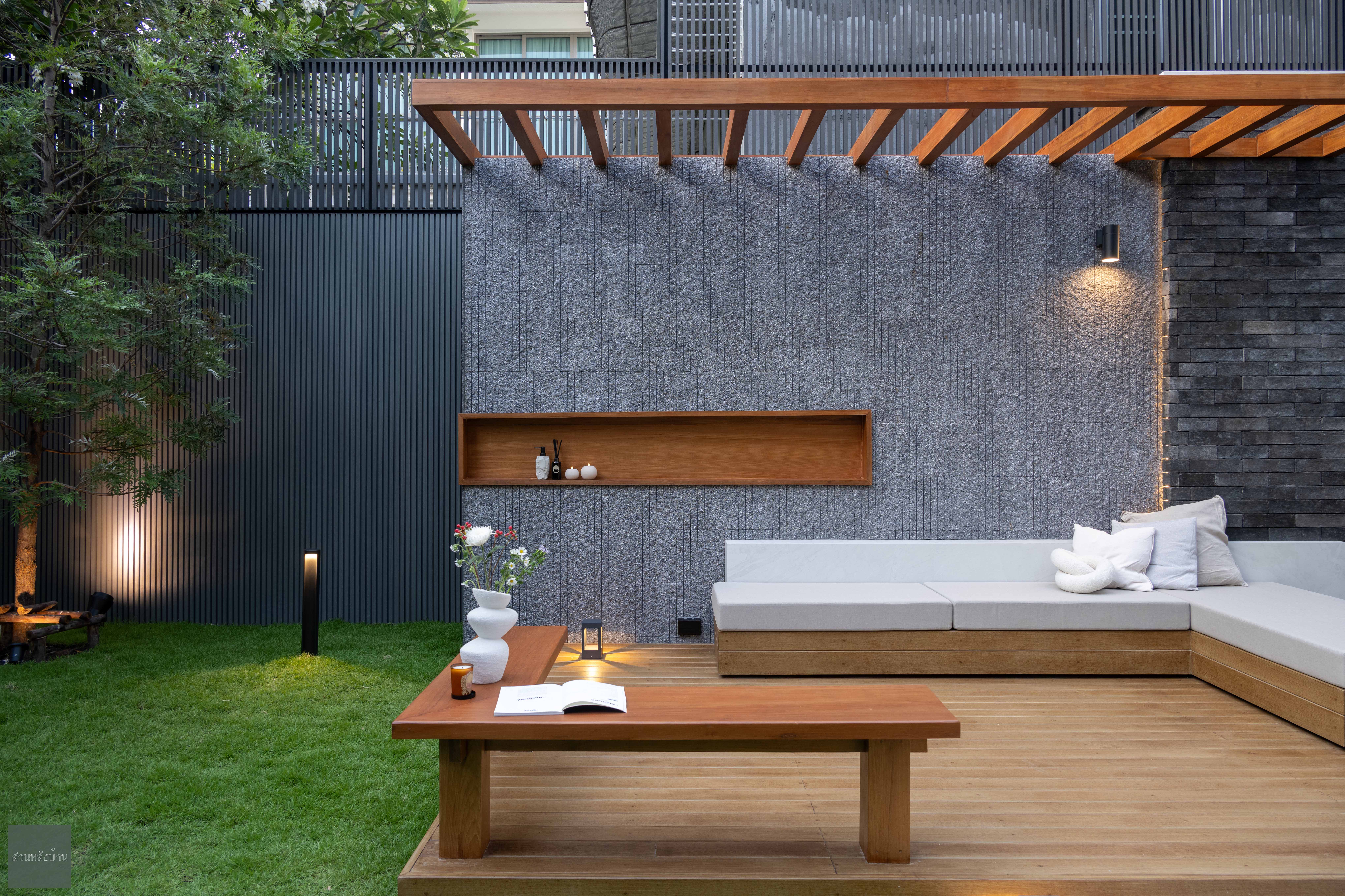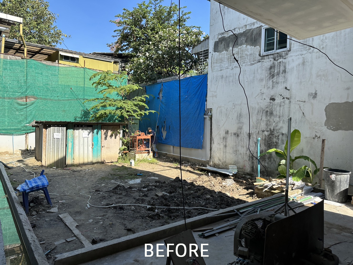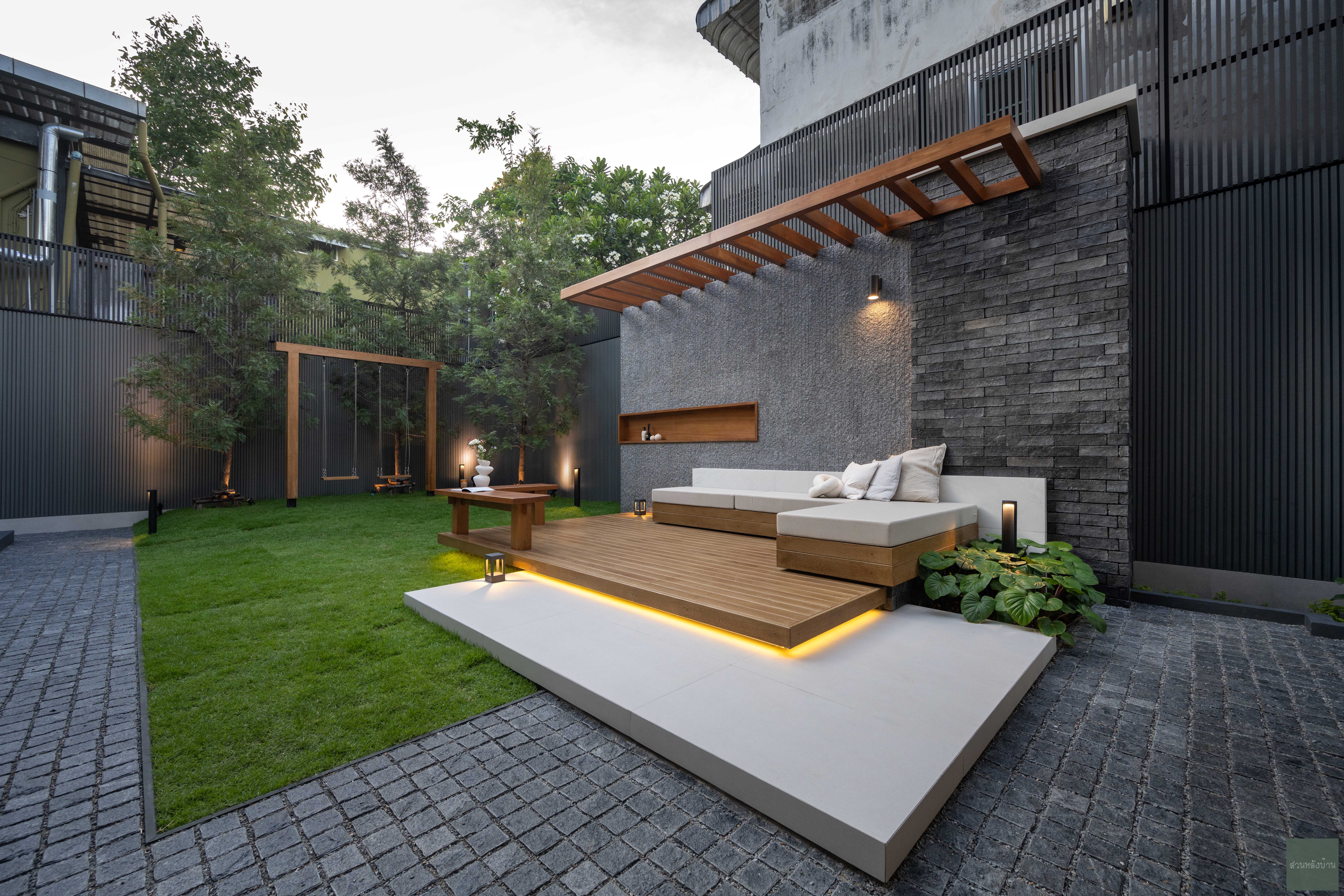 สวนถูกคิดและออกแบบมาตั้งแต่บ้านกำลังสร้าง ด้วยเงื่อนไขของพื้นที่และขั้นตอนการก่อสร้างด้วย เลยทำให้การก่อสร้างพื้นที่นั่งเล่นนี้ต้องถูกจัดทำไปพร้อมๆกัน เจ้าของบ้านมอบโจทย์มาว่า ต้องการพื้นที่โปร่งๆไว้ให้เด็กๆวิ่งเล่น รองรับหลายกิจกรรม อยากได้พื้นที่ที่ทำให้รู้สึกเหมือนได้ออกมานั่งกลางแจ้ง เพราะด้วยตำแหน่งของบ้านที่อยู่ในใจกลางเมืองที่มีพื้นที่จำกัดแต่ยังอยากมีพื้นที่ที่ยังพักผ่อนได้อย่างเป็นส่วนตัว