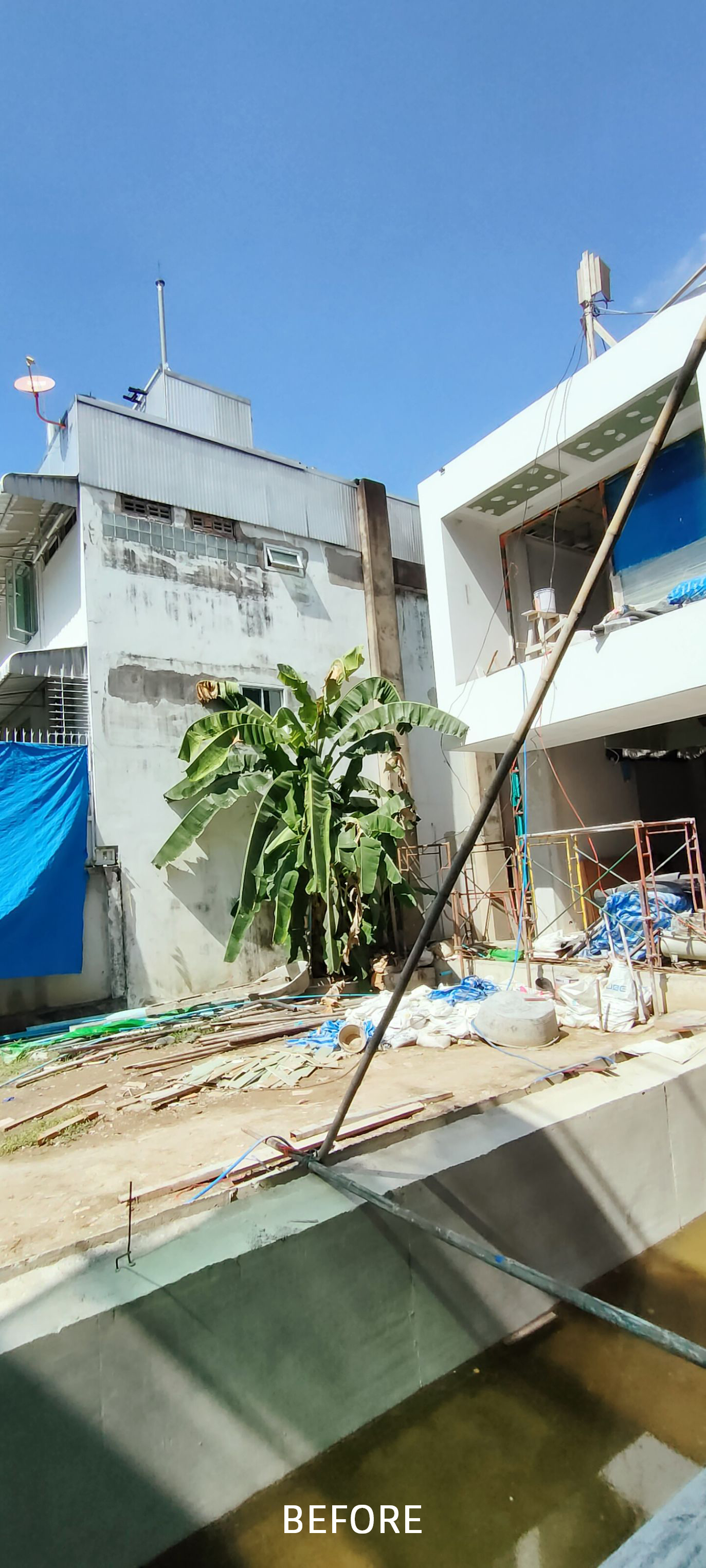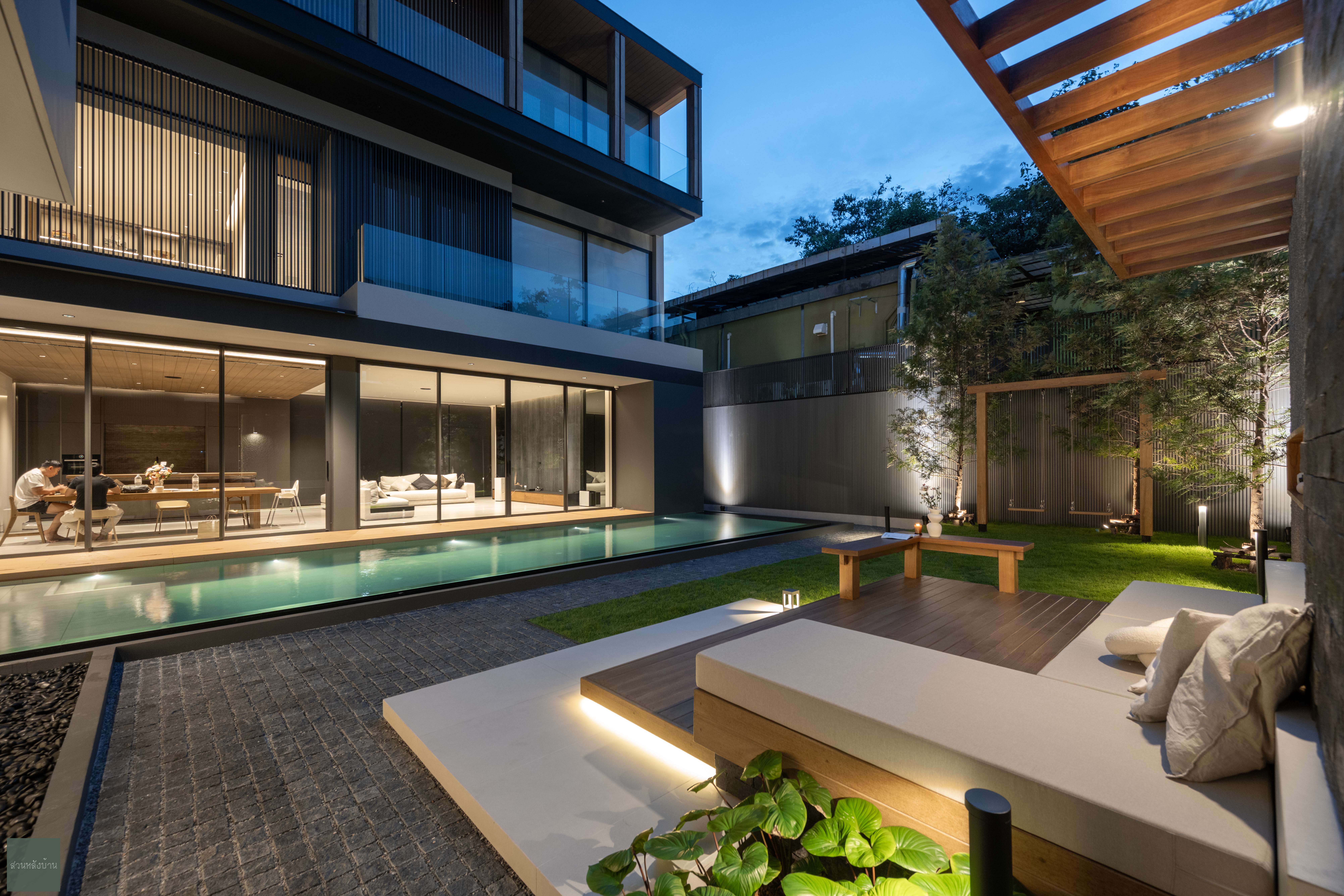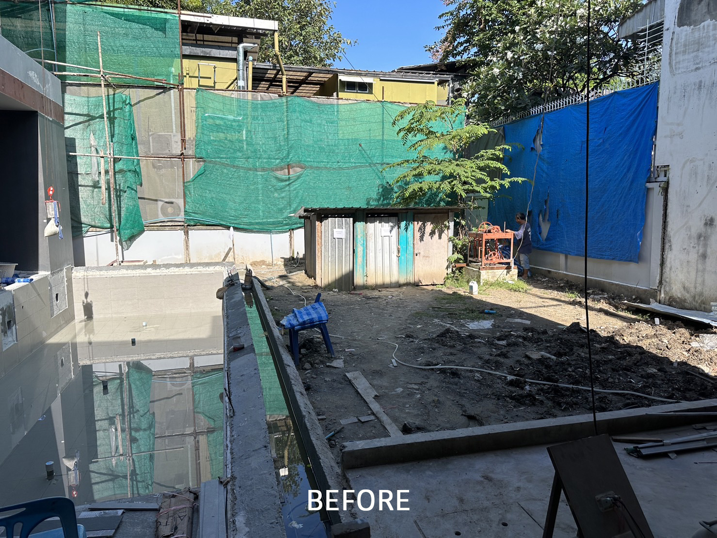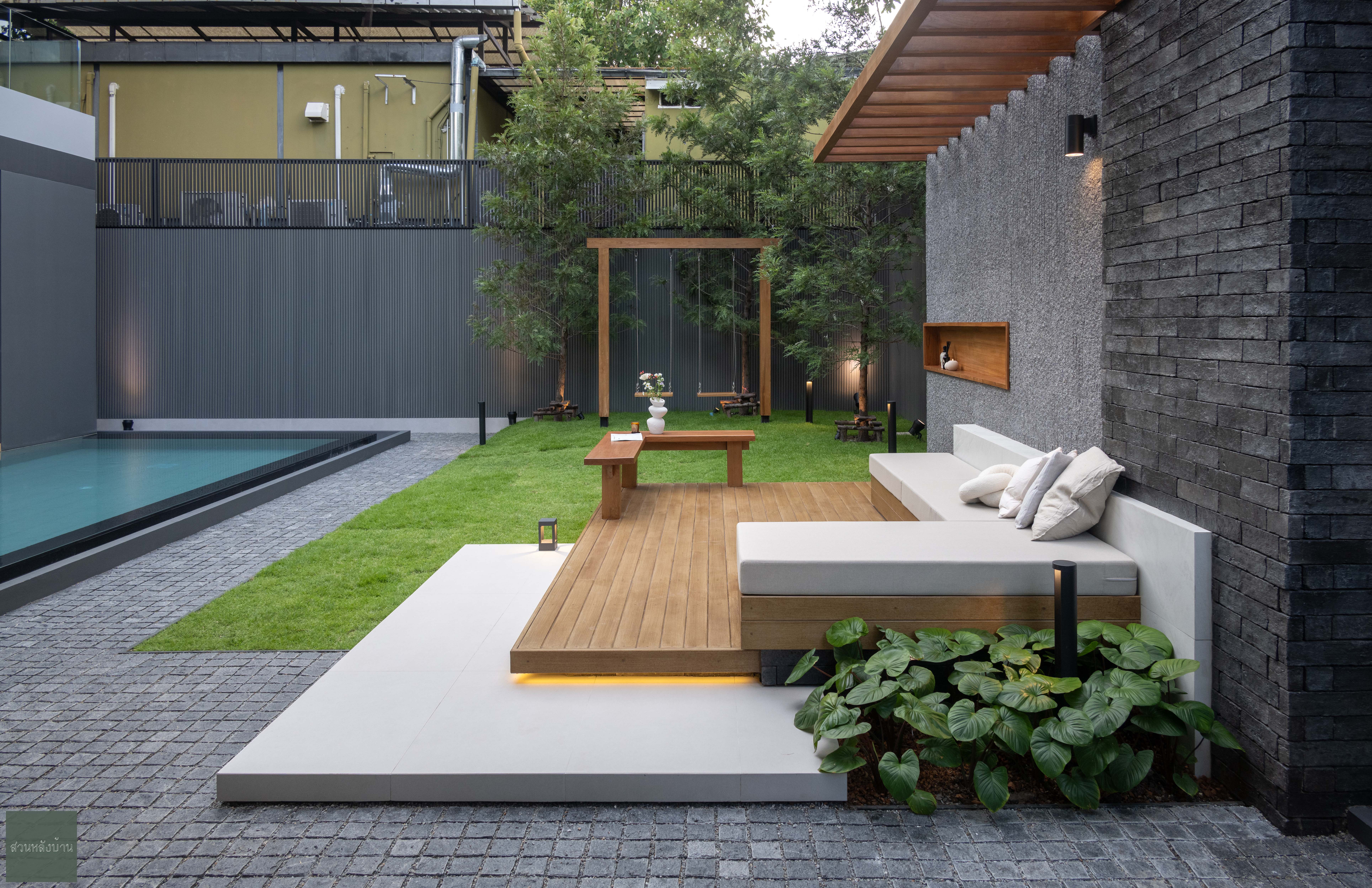 สวนถูกคิดและออกแบบมาตั้งแต่บ้านกำลังสร้าง ด้วยเงื่อนไขของพื้นที่และขั้นตอนการก่อสร้างด้วย เลยทำให้การก่อสร้างพื้นที่นั่งเล่นนี้ต้องถูกจัดทำไปพร้อมๆกัน เจ้าของบ้านมอบโจทย์มาว่า ต้องการพื้นที่โปร่งๆไว้ให้เด็กๆวิ่งเล่น รองรับหลายกิจกรรม อยากได้พื้นที่ที่ทำให้รู้สึกเหมือนได้ออกมานั่งกลางแจ้ง เพราะด้วยตำแหน่งของบ้านที่อยู่ในใจกลางเมืองที่มีพื้นที่จำกัดแต่ยังอยากมีพื้นที่ที่ยังพักผ่อนได้อย่างเป็นส่วนตัว