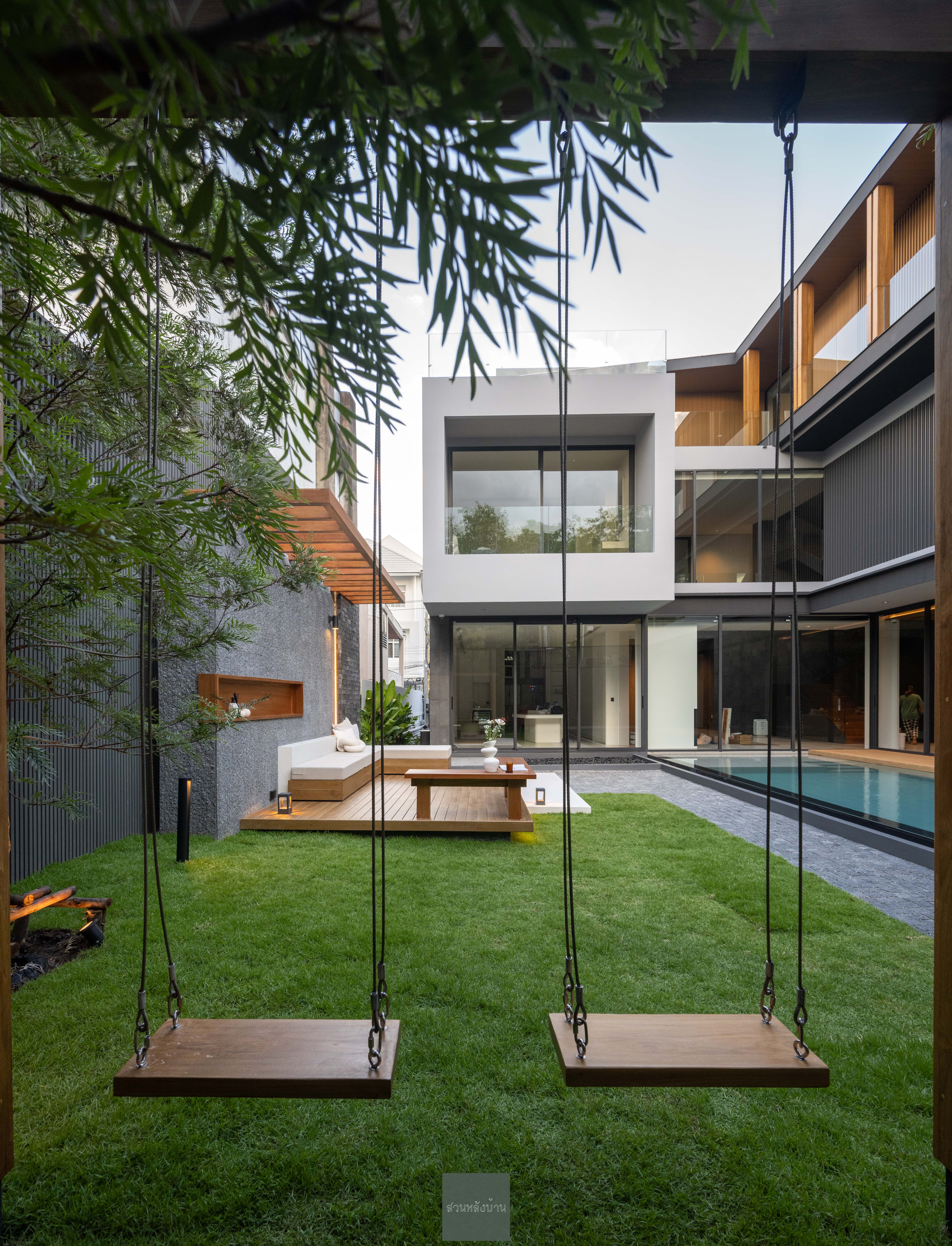 เราเพิ่มชิงช้าแบบเด็กๆที่สามารถแกว่งได้สูงกว่าชิงช้าที่เป็นลักษณะม้านั่ง เพื่อเพิ่มความสนุกให้กับสวน พื้นที่ของหญ้าเราทำให้มีลูกเล่นด้วยเนินเล็กๆ ทำให้พื้นที่ดูไม่แคบ พื้นที่นั่งที่เราออกแบบมา เราเอาวัสดุธรรมชาติเช่น หิน ไม้ มาใช้ในงาน เพื่อให้ส่วนพักผ่อนเล็กๆ ดูมีรายละเอียด เสน่ห์ของวัสดุธรรมชาติ ช่วยดึงดูดให้งานมีเอกลักษณ์ ให้ความรู้สึกอบอุ่น ตามกาลเวลา