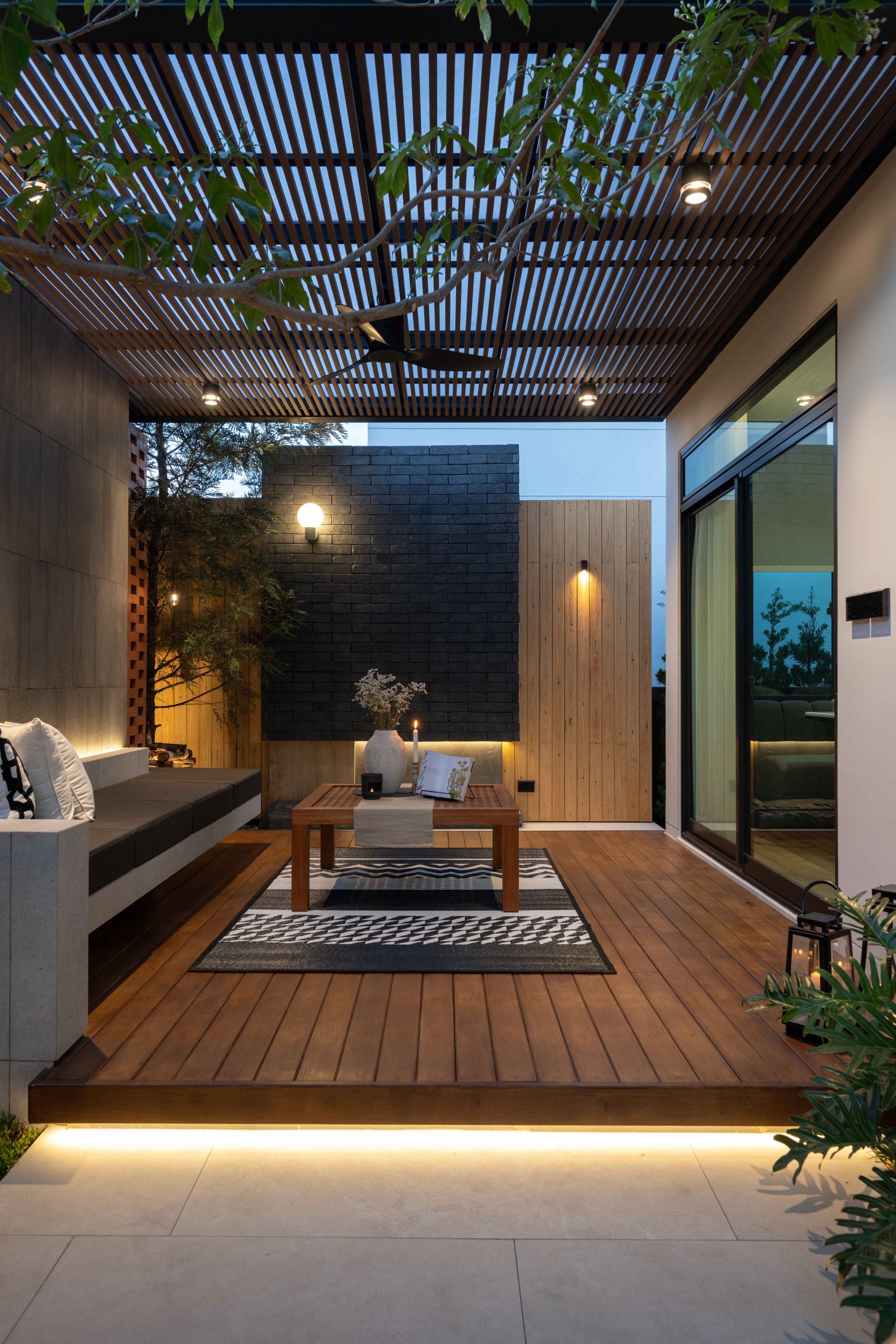 บรรยากาศที่ให้ความรู้สึกเป็นมุมนั่งเล่นกลางสวนที่เรียบง่ายแต่ดูอบอุ่นและผ่อนคลาย โทนสีของวัสดุตกแต่งเน้นความเป็นธรรมชาติ ผสานงานไม้กับผนังอิฐสีเข้มเพิ่มมิติและความสงบ เฟอร์นิเจอร์ไม้และของตกแต่งน้อยชิ้นช่วยสร้างบรรยากาศที่ไม่วุ่นวาย เหมาะสำหรับเป็นมุมพักผ่อน จิบกาแฟ หรืออ่านหนังสือท่ามกลางความร่มรื่นของต้นไม้และแสงไฟในยามค่ำคืน เพิ่มเสน่ห์ให้มุมเล็กๆ นี้ดูมีชีวิตชีวาแต่ยังคงความสงบสบายตาอย่างลงตัว.