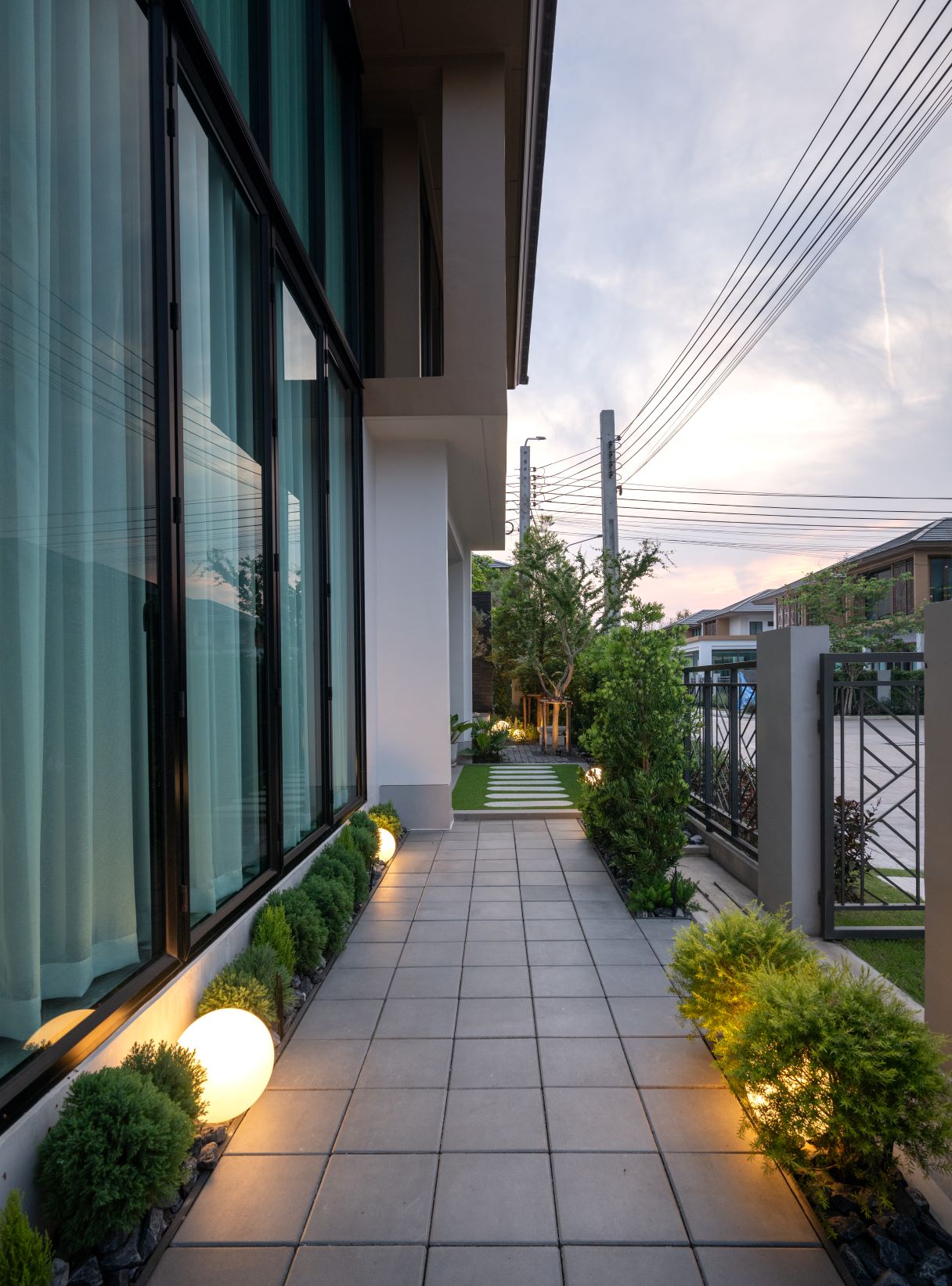 ทางเข้าด้านหน้าก่อนไปถึงสวนที่วางตัวอยู่ด้านข้างของตัวบ้าน ก็ถูกปูพื้นทางเดินให้เรียบร้อย ลดการดูแลตัดแต่งต่างๆ ด้วยการปลูกต้นไม้พุ่มเฉพาะในกรอบที่เราจัดวางไว้ และลดการปูหญ้าลง เพราะด้วยไลฟ์สไตล์ที่เจ้าของบ้านไม่ได้มีเวลาดูแลสวนมากนัก ส่วนปลายสายตาจะเป็นต้นไม้ใหญ่ต่างๆที่เจ้าของบ้านชอบและจัดหามาให้ทางเราช่วยจัดหาที่วางให้เข้ากับงานออกแบบ เป็นการทำงานสวนที่ได้ร่วมไปกันกับเจ้าของบ้าน ระหว่างการก่อสร้าง เราได้ปรึกษาความเห็น ความชอบ กับเจ้าของบ้าน และปรับใช้กับสวน ในขณะเดียวกัน เราก็ให้คำปรึกษาทั้งด้านความสวยงาม วัสดุและพันธุ์พืชกับการดูแลรักษา ทำให้การทำงานออกมาเป็นไปตามที่เจ้าของบ้านต้องการและเป็นอีกงานที่สวยโรแมนติกตามภาพที่เราออกแบบไว้