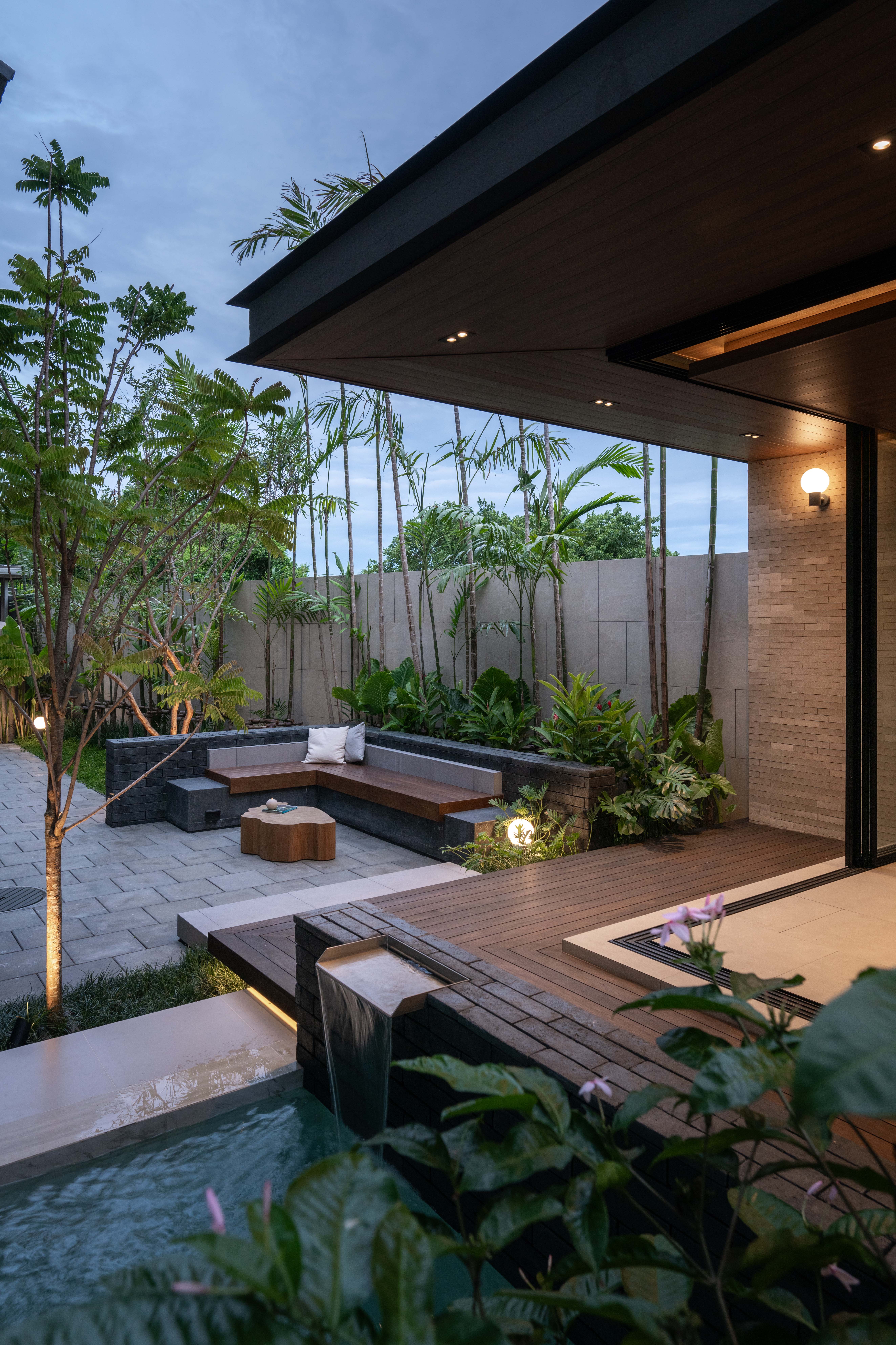 เราเพิ่งเสียงน้ำด้วยการเติมน้ำตกให้กับสวน โดยใช้ระบบเดิมของสระว่ายน้ำที่เจ้าของบ้านมีอยู่แล้ว แต่ปรับมุมมอง ที่มีฉากเดิมของสระว่ายน้ำกั้นมุมมองที่เข้าสู่สวนออก และทำเป็นแท่นน้ำตกเตี้ยๆที่สามารถนั่งได้ และทำหน้าที่เหมือนราวกันตก เวลาเดิมอยู่บนระเบียงไม้ ไม้จริงที่นำมาใช้เป็นพื้นระเบียงนั้น ช่วยทำให้บรรยากาศของสวนดูสุขุมและอบอุ่นมาก เวลาถอดรองเท้าเดิน เท้าได้สัมผัสกับผิวไม้โดยตรง เป็นการรับรู้ถึงธรรมชาติอีกวิธีหนึ่ง