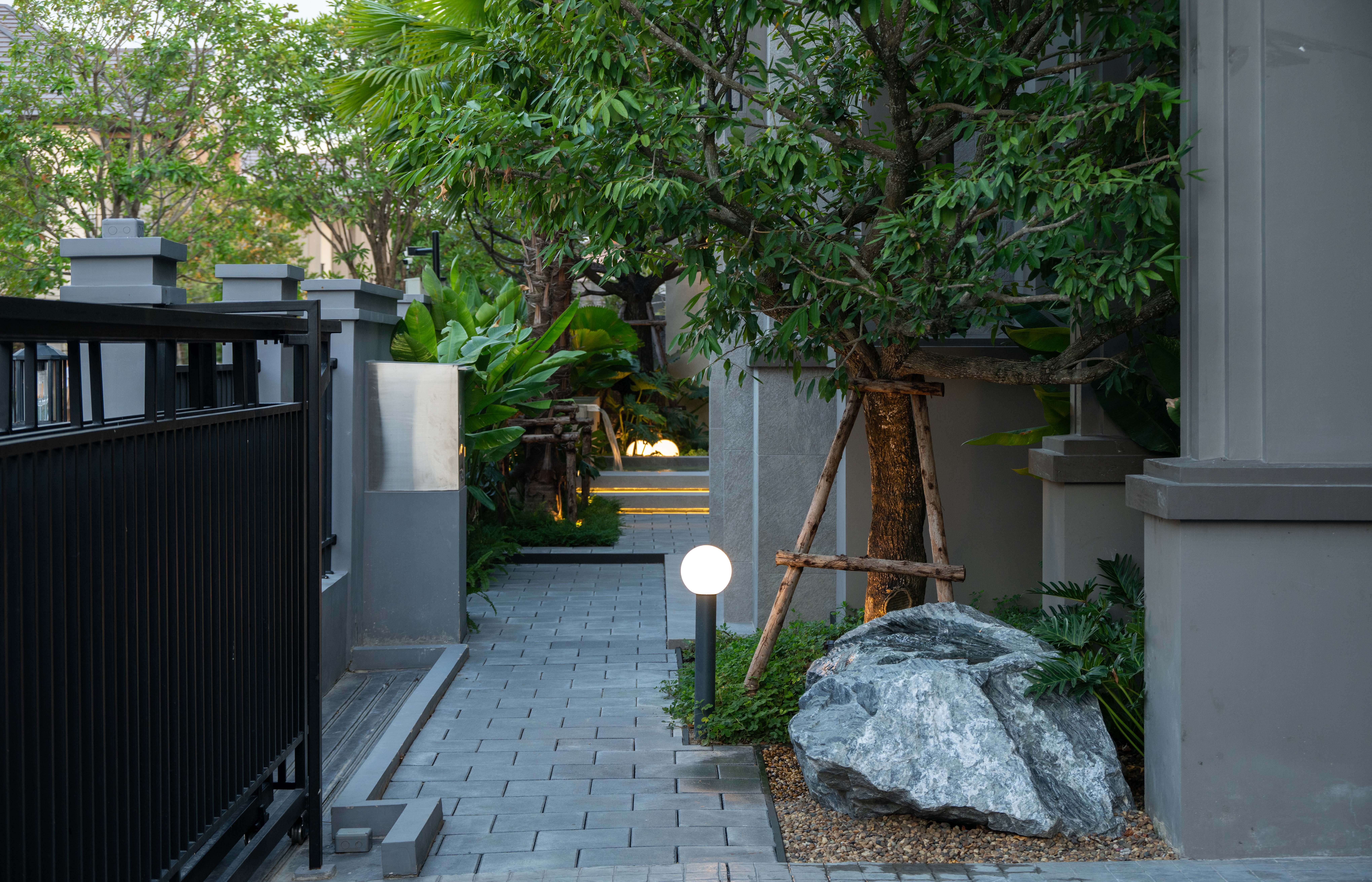 สวนโมเดิร์นรีสอร์ทในบ้านส่วนตัว คือการแปลแนวคิดนี้ออกมาเป็นรูปธรรม ด้วยภาษาการออกแบบที่เรียบ ชัด สงบ และร่วมสมัย ใช้เส้นสายที่นิ่ง วัสดุที่ให้ผิวสัมผัสจริง และองค์ประกอบธรรมชาติที่ถูกจัดวางอย่างมีจังหวะ ไม่ว่าจะเป็นไม้ โครงสร้างร่มเงา เสียงน้ำ หรือพื้นที่นั่งพัก สวนไม่ได้เป็นเพียงฉากสีเขียว แต่เป็น “ที่พักผ่อนกลางแจ้ง” ที่เชื่อมต่อกับตัวบ้านและวิถีการใช้ชีวิตประจำวัน