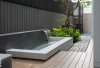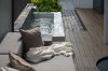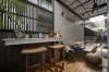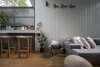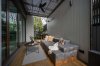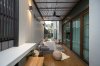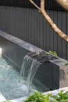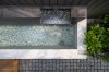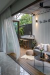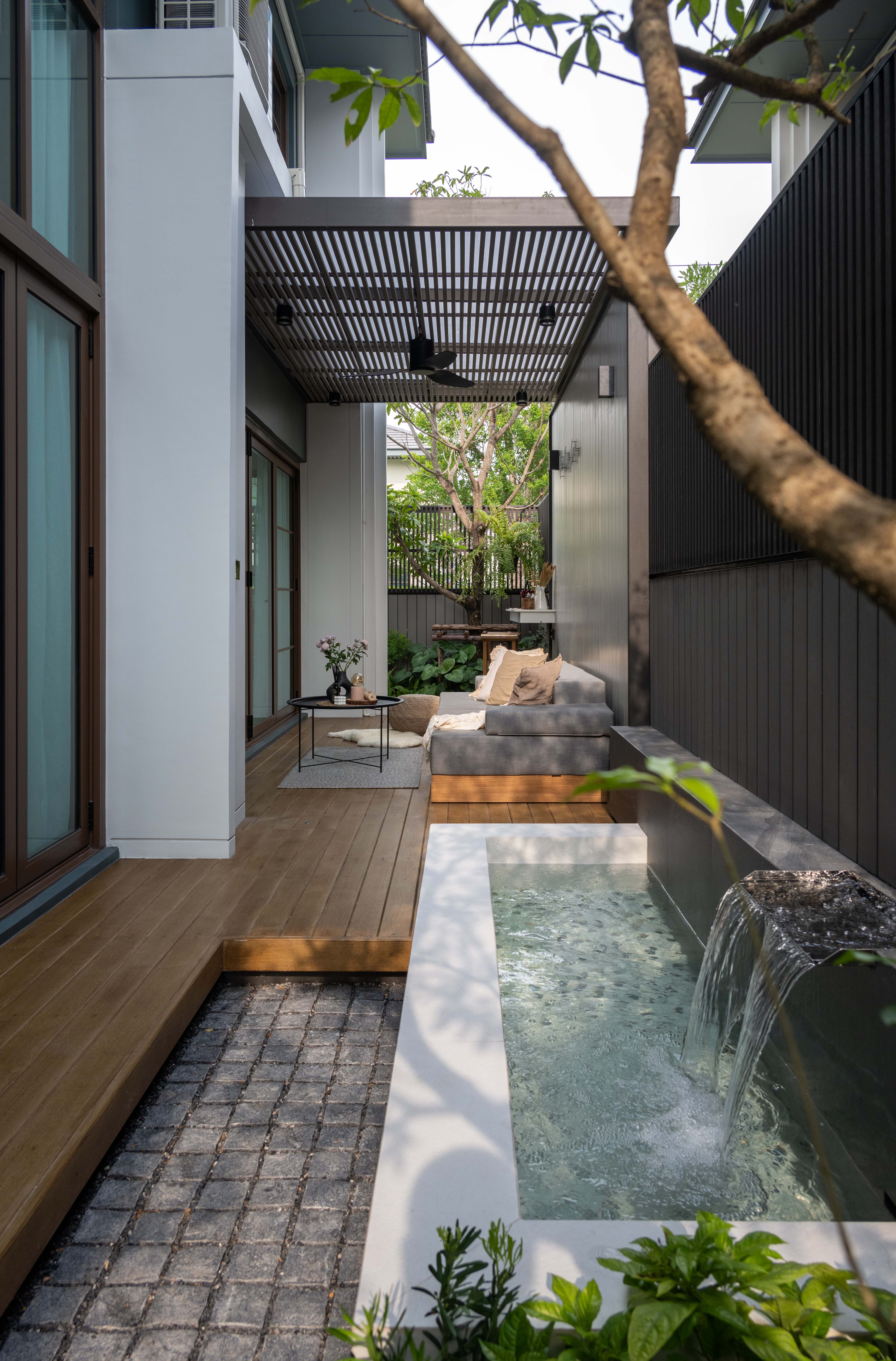โดยออกแบบให้ฟังก์ชั่นนั่งเล่นกับบ่อน้ำตก วางตำแหน่งตรงกันกับช่องเปิดประตู เลยทำให้ไม่รู้สึกแคบเลยเวลาใช้งาน เพราะพื้นที่เชื่อมถึงต่อกันถึงภายในบ้าน