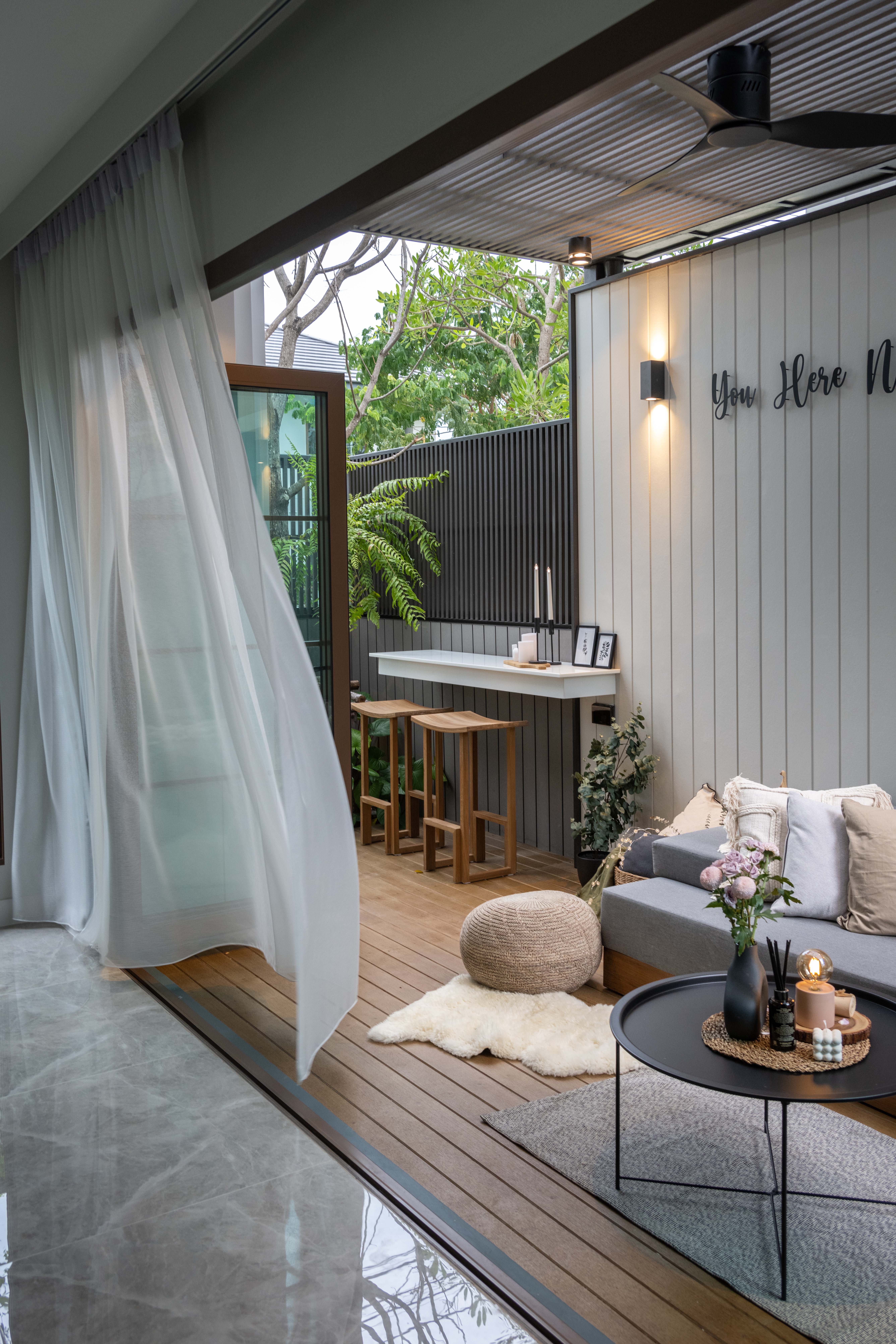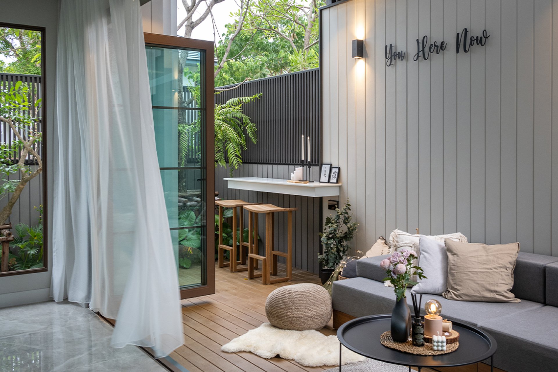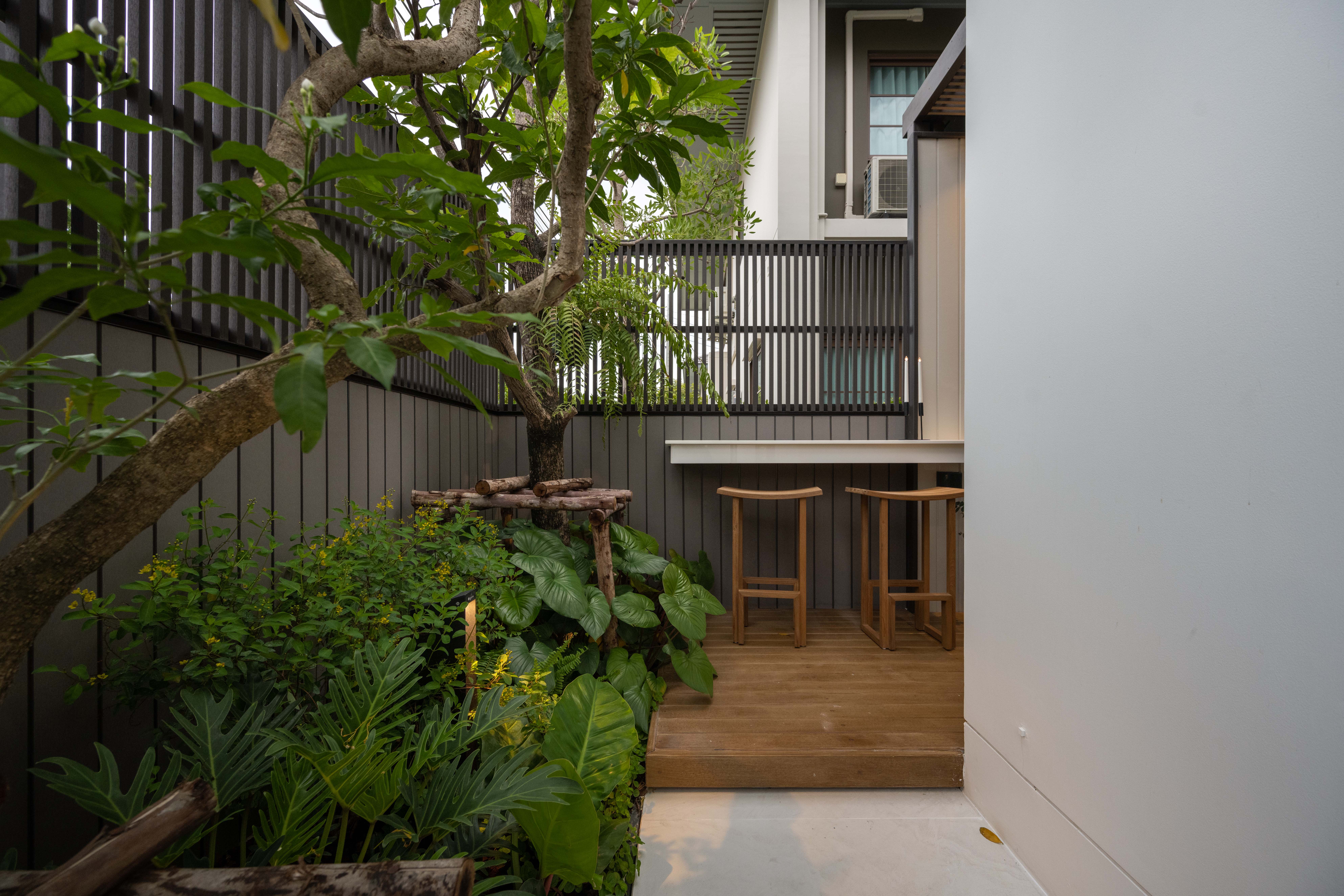 ลมพัดสบายๆและฟังเสียงน้ำตกจากทุกมุมของบ้าน เพิ่มความเป็นส่วนตัวด้วยรั้วที่โอบล้อมตั้งแต่หน้าบ้านถึงหลังบ้าน เติมความร่มรื่นและเขียวขจีด้วยพันธุ์ไม้ที่มีเอกลักษณ์ของใบ รวมถึงไม้ยืนต้นที่มีฟอร์มลีลา ดูแล้วสวนยิ่งดูมีลูกเล่น น่านั่งมากขึ้น