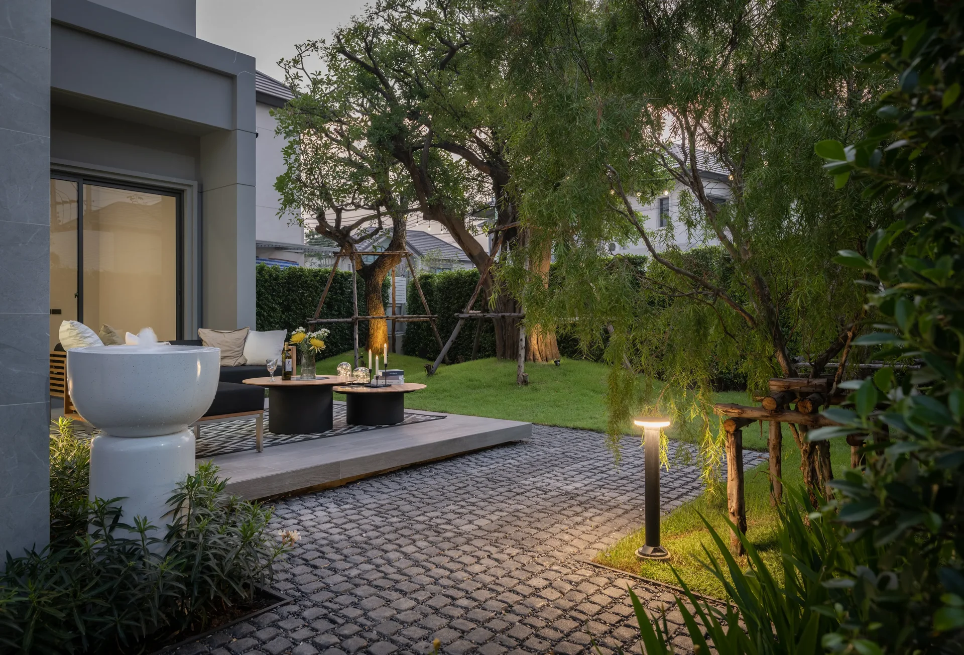 สวนฝั่งด้านหน้าของบ้านเป็นชานโล่ง ไว้ปาร์ตี้มองดูดาว มีร่มเงาของต้นไม้ใหญ่ เอาไว้ให้เด็กได้วิ่งเล่นตอนกลางวัน