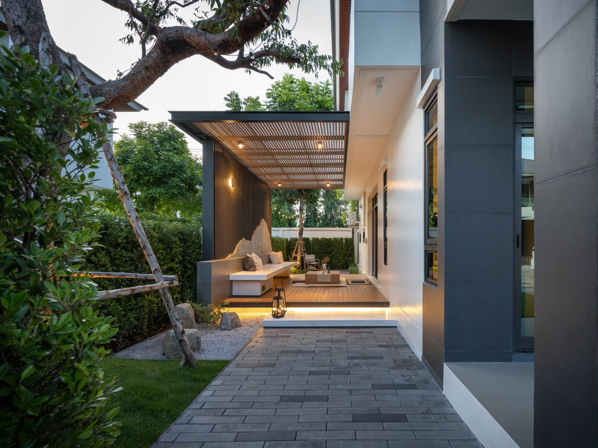 ช่วงเวลาเย็นก่อนพระอาทิตย์จะลับขอบฟ้า บรรยากาศกำลังเงียบสงบ มีมุมๆนึงในบ้าน กำลังเชิญชวนให้ออกมานั่งเล่น รับแสงแดดบางๆ ก่อนจะมืดลง เราเอางานอดิเรกออกมานั่งทำข้างนอก มีโต๊ะกลางขนาดใหญ่ วางของได้เยอะ ด้านหลังเป็นม้านั่งยาวที่พรางตัวเนียนไปกับศาลา ทางเดินไปด้านหลังบ้าน มีลานโล่งๆ ที่เตรียมเอาไว้เป็นลานบาร์บีคิว และตกแต่งด้วยไฟให้ได้บรรยากาศอบอุ่นในตอนค่ำ.