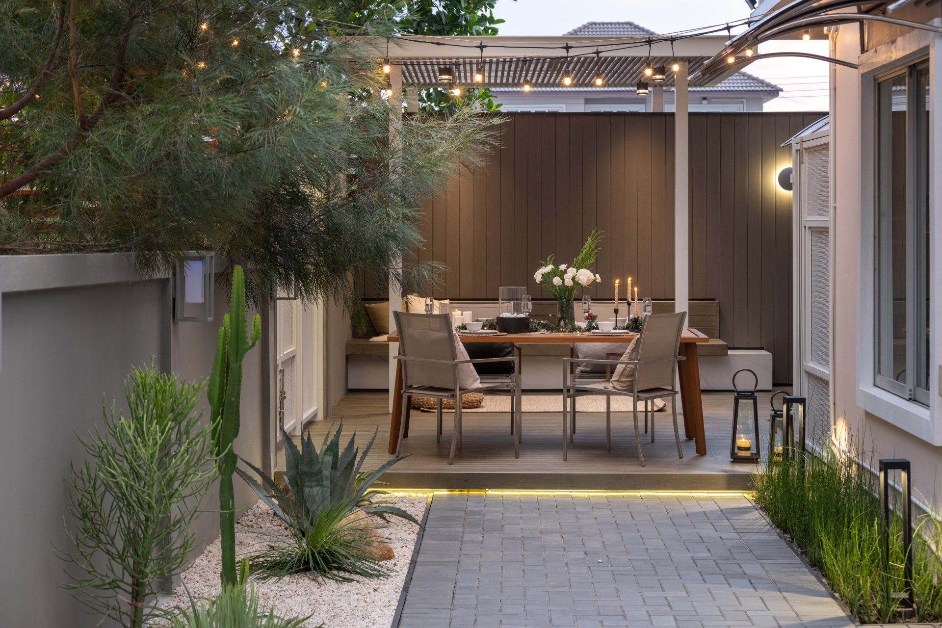 Mirror layout houses made their garden next to each other, The owner want to connect their space but still want to make the zoning clear so we decided to do a garden gate to separate their space and using a perforated sheet as door material. We emphasize the low maintenance key to the tree concept we had planted, mostly we select some plants that don't need to watering much or having low dehydration