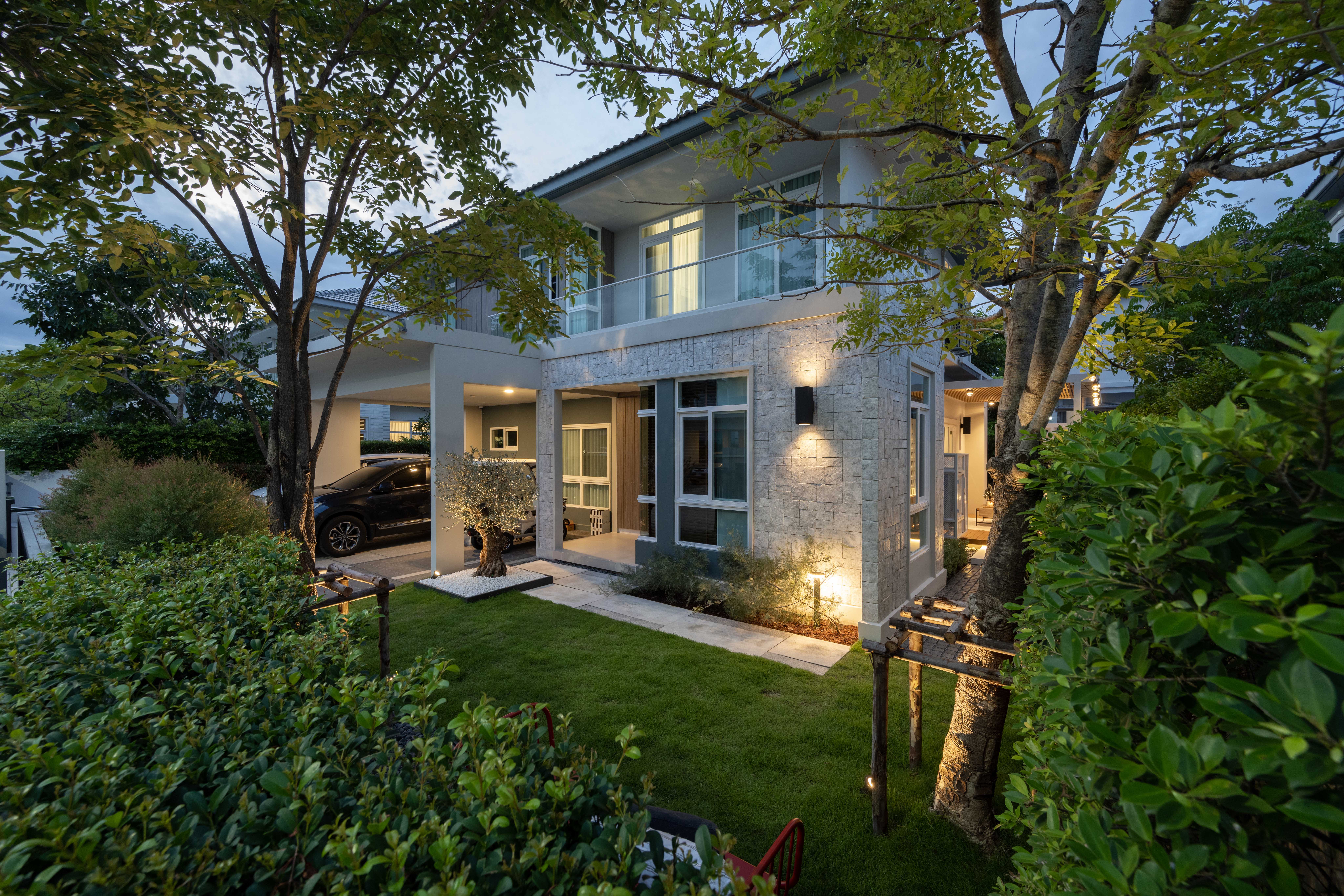 In front of the house, the owner wants to keep the lawn for their children to run around and an olive tree in front of the working room.