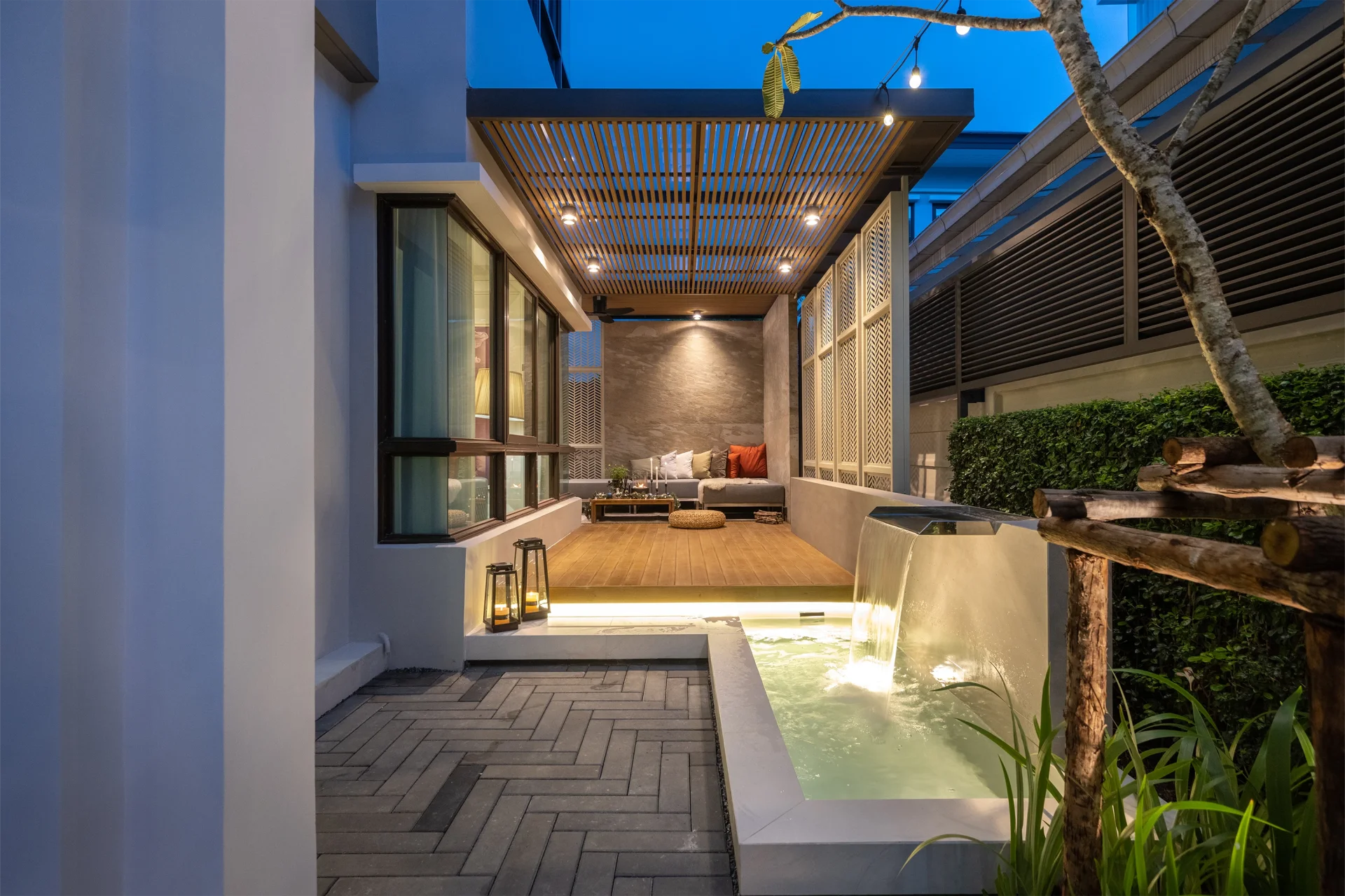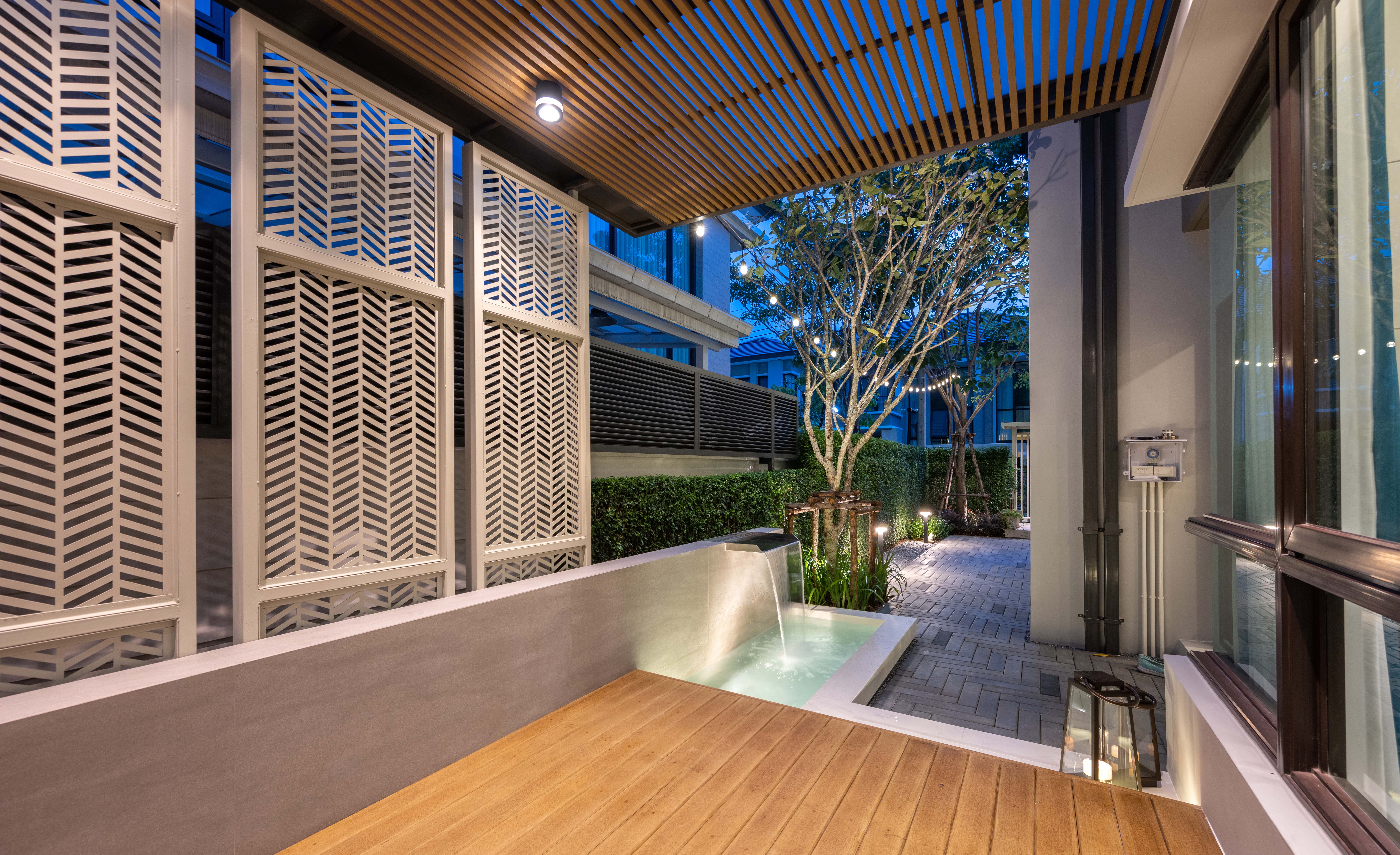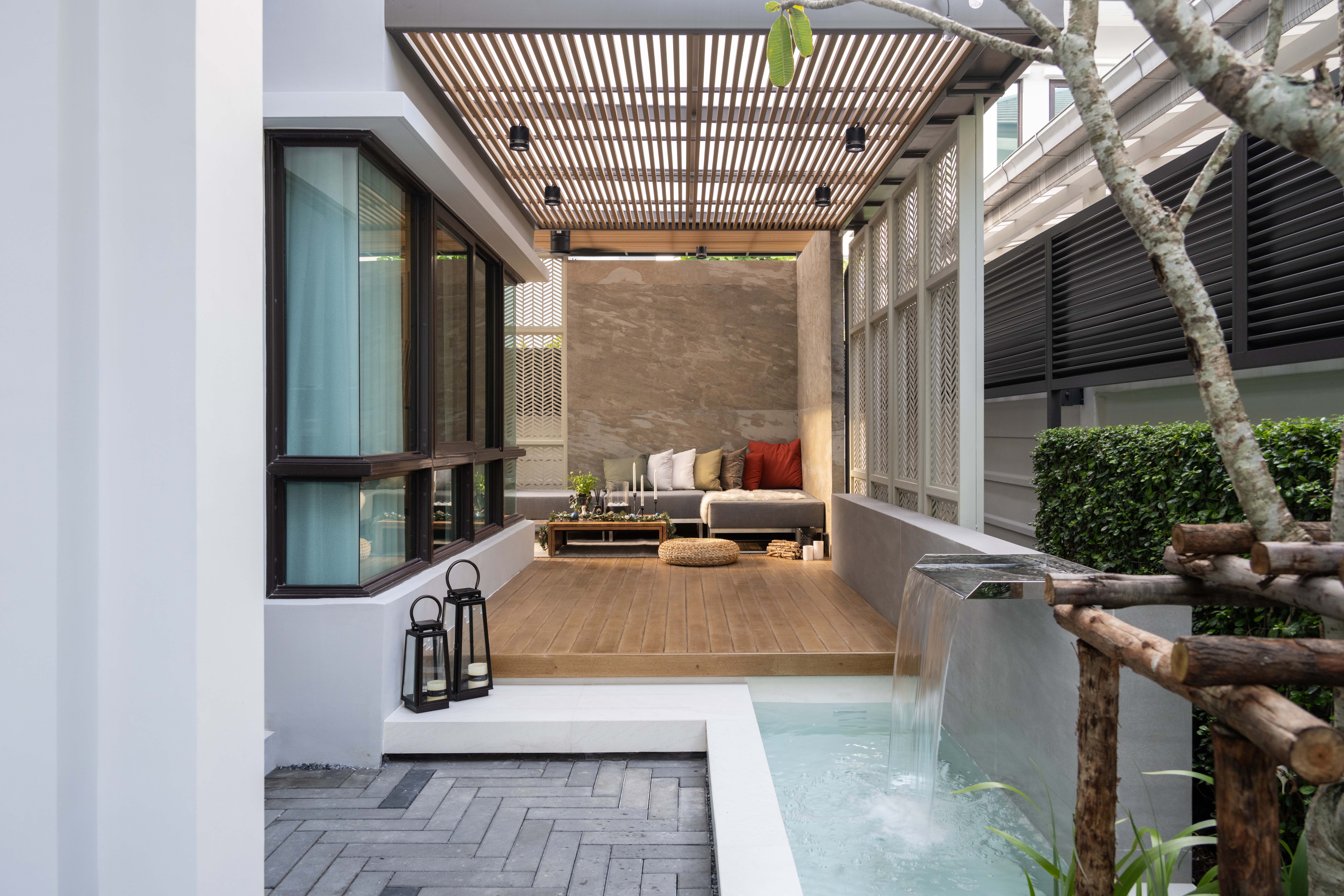 บ่อน้ำตกที่ถูกจัดวางให้มองเห็นได้ทุกมุมทั้งจากภายในและภายนอกบ้าน วางเล่นระดับกับพื้นศาลา
