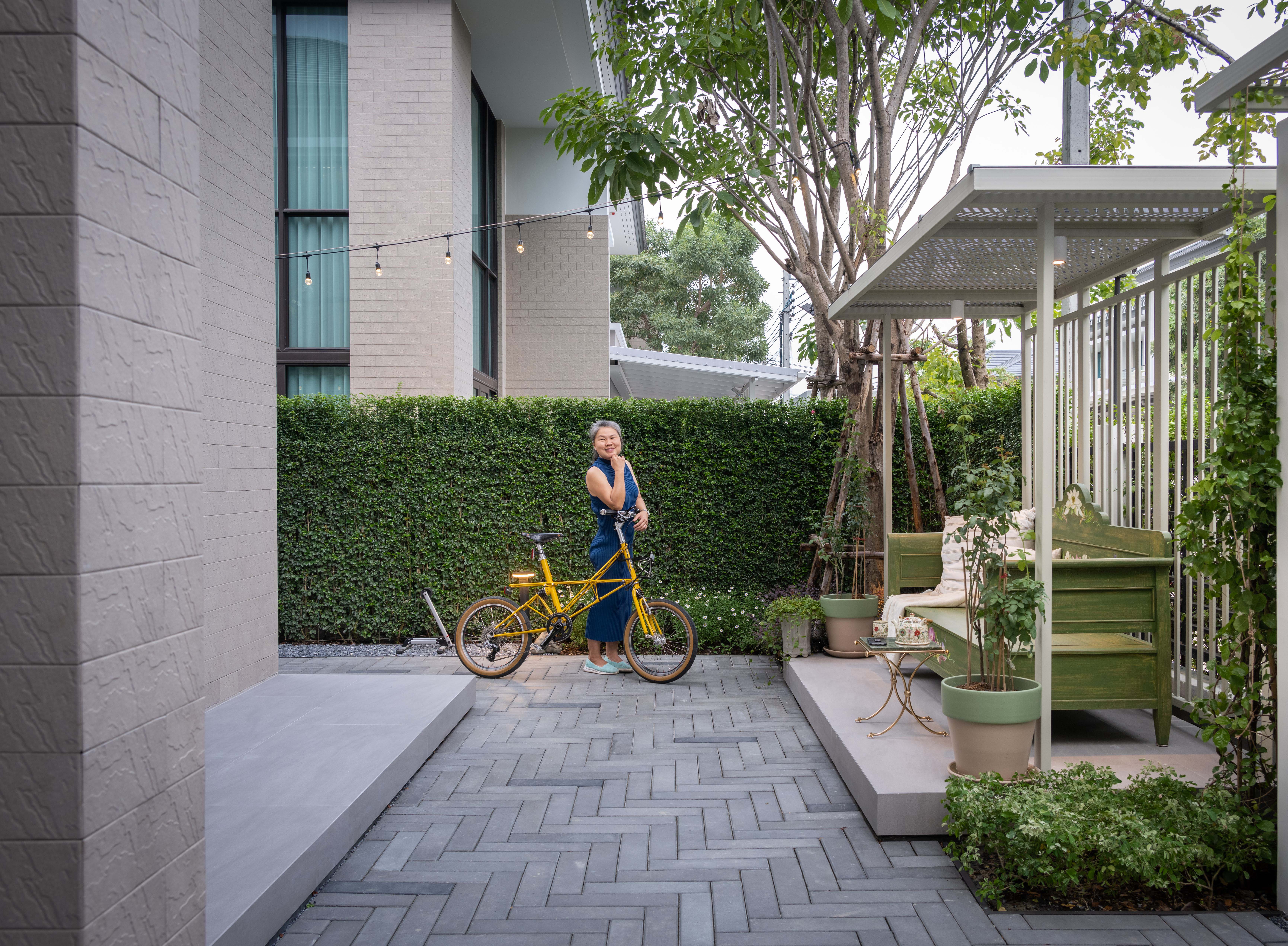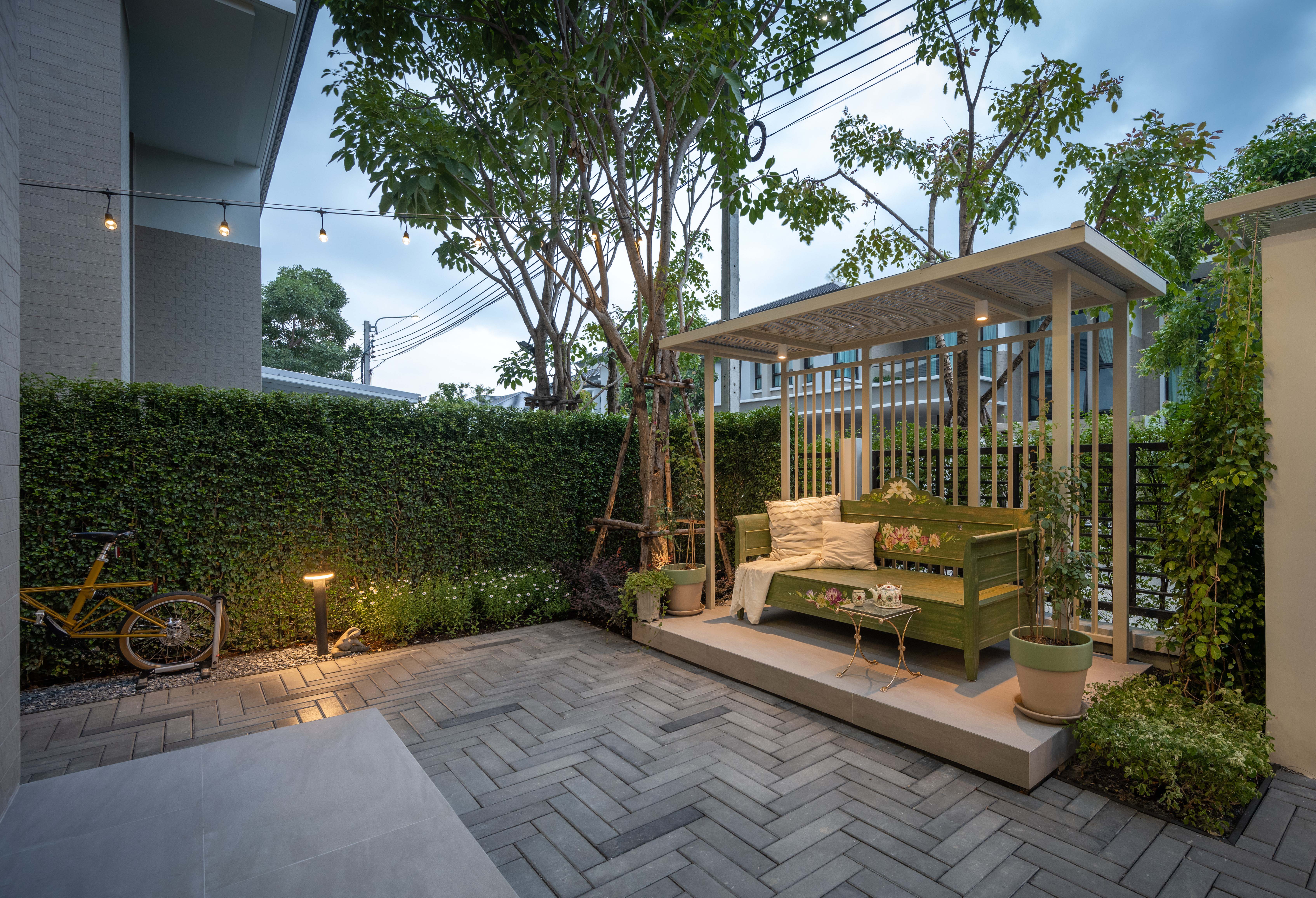 ชานพักสบายๆก่อนเดินเข้าบ้าน ไว้รับแขกหรือไว้กินกาแฟก่อนออกจากบ้านก็ได้ เฟอร์นิเจอร์ที่นำมาวางเป็นสีโทนเดียวกันกับงาน ซึ่งเป็นสีโปรดของเจ้าของบ้าน ทำให้สวน ได้แสดงออกถึงความชอบ และเอกลักษณ์ของเจ้าของบ้าน เหมือนสวนถูกสร้างขึ้นมาให้กับเจ้าของบ้านโดยเฉพาะ.