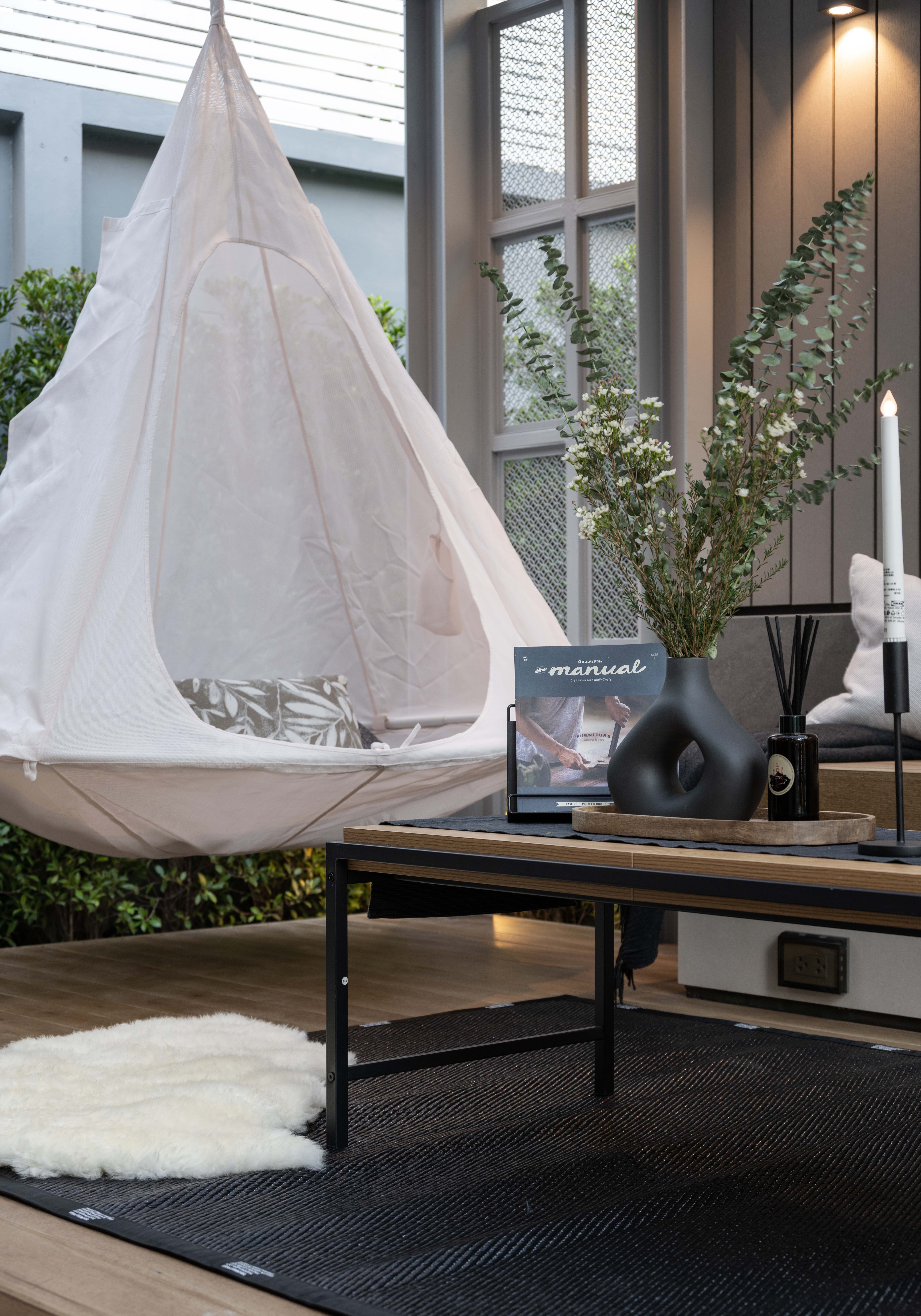 เรามองว่า การทานกาแฟตอนเช้า บางที ก็เป็นช่วงเวลาที่เรา ได้ใช้ความคิด เลยเพิ่มชิงช้าเข้าไปด้วย จะได้เป็นอีกแบบที่จะได้นั่งคิดอะไรเพลินๆ ไปพร้อมๆกับแกว่งชิงช้าเบาๆ ชิงช้า ดีไซน์แปลกใหม่ ที่เข้ามาช่วยลดทอนความเป็นอาคารทรงเหลี่ยมของศาลาลงไป ทำให้งานถูกเพิ่มมิติของรูปทรง และความรู้สึก casual ที่สามารถออกมาใช้งานได้จริงในทุกๆวัน.