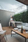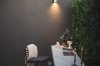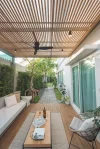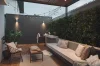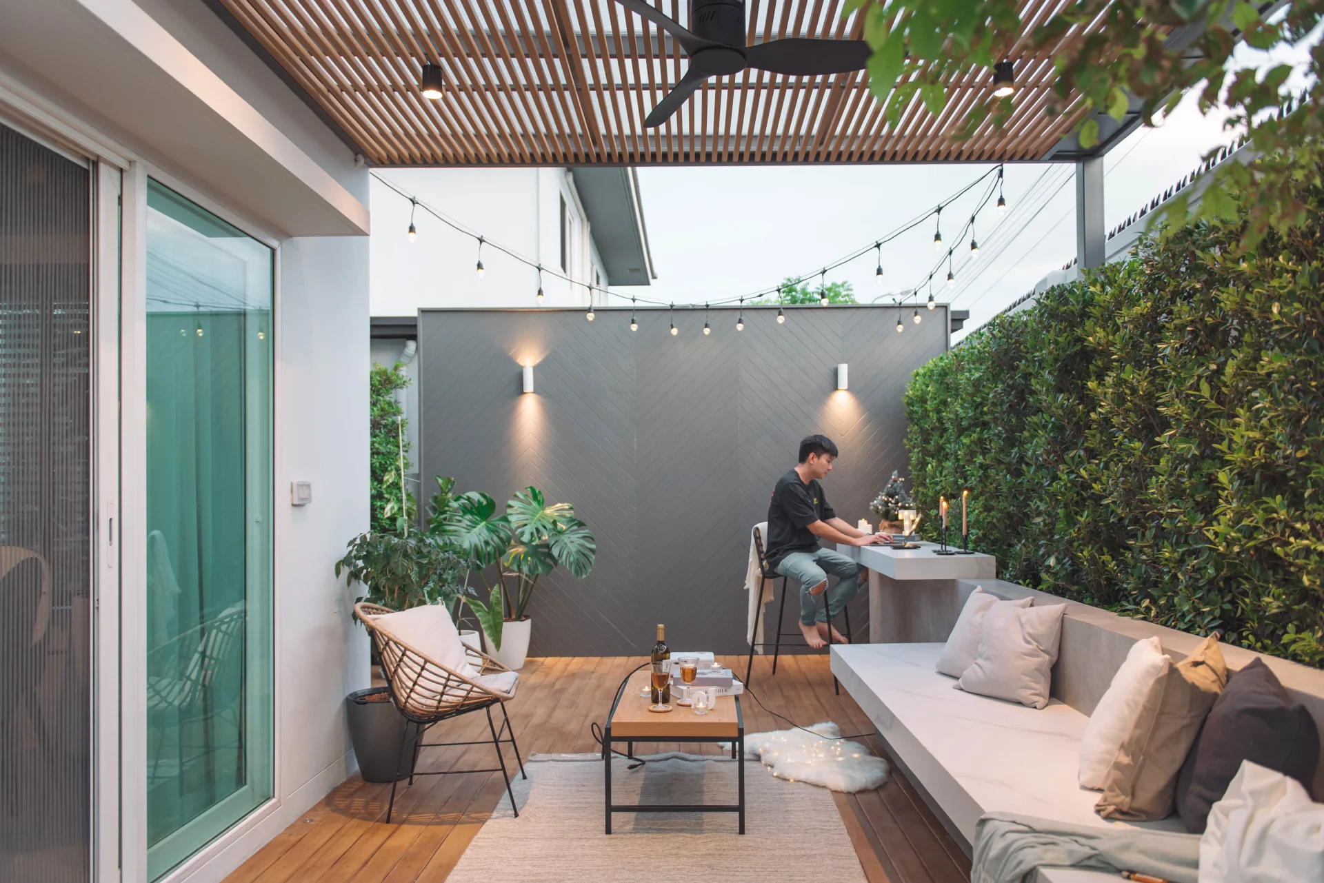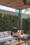 พื้นที่multi function เมื่อได้ก้าวออกจากบ้าน เป็นพื้นที่นั่งทำงาน นั่งพักผ่อนหรือสังสรรค์ มีหลังคาโปร่งไว้เป็นร่มเงาตอนกลางวัน ไม่ให้แสงแดดสะท้อนเข้าสู่ภายในบ้านโดยตรงผนังตกแต่งสีเข้มเป็นจุดปะทะสายตาอย่างแรกเวลาเดินเข้ามาในสวนเล่นลวดลายเดียวกันกับบล็อคปูพื้น ให้สื่อออกมาเป็นเนื้อเรื่องเดียวกันของงานสีที่นำมาใช้ในงานจะเน้นเป็นโทนขาว เทาและเทาเข้ม นอกจากเข้ากับความชอบของเจ้าของบ้านแล้วยังตัดกันกับสีไม้ใบที่เจ้าของบ้านสะสมไว้ ช่วยขับให้ต้นไม้ดูเด่น และภาพรวมของงานให้ความรู้สึกอบอุ่นได้โอบล้อมอยู่ในอาณาจักรต้นไม้ของตัวเอง เป็นอีกหนึ่ง สวนหลังบ้าน ที่สะท้อนตัวตนของเจ้าของบ้านผ่านงานสวนที่เราออกแบบให้ด้วยใจ.
