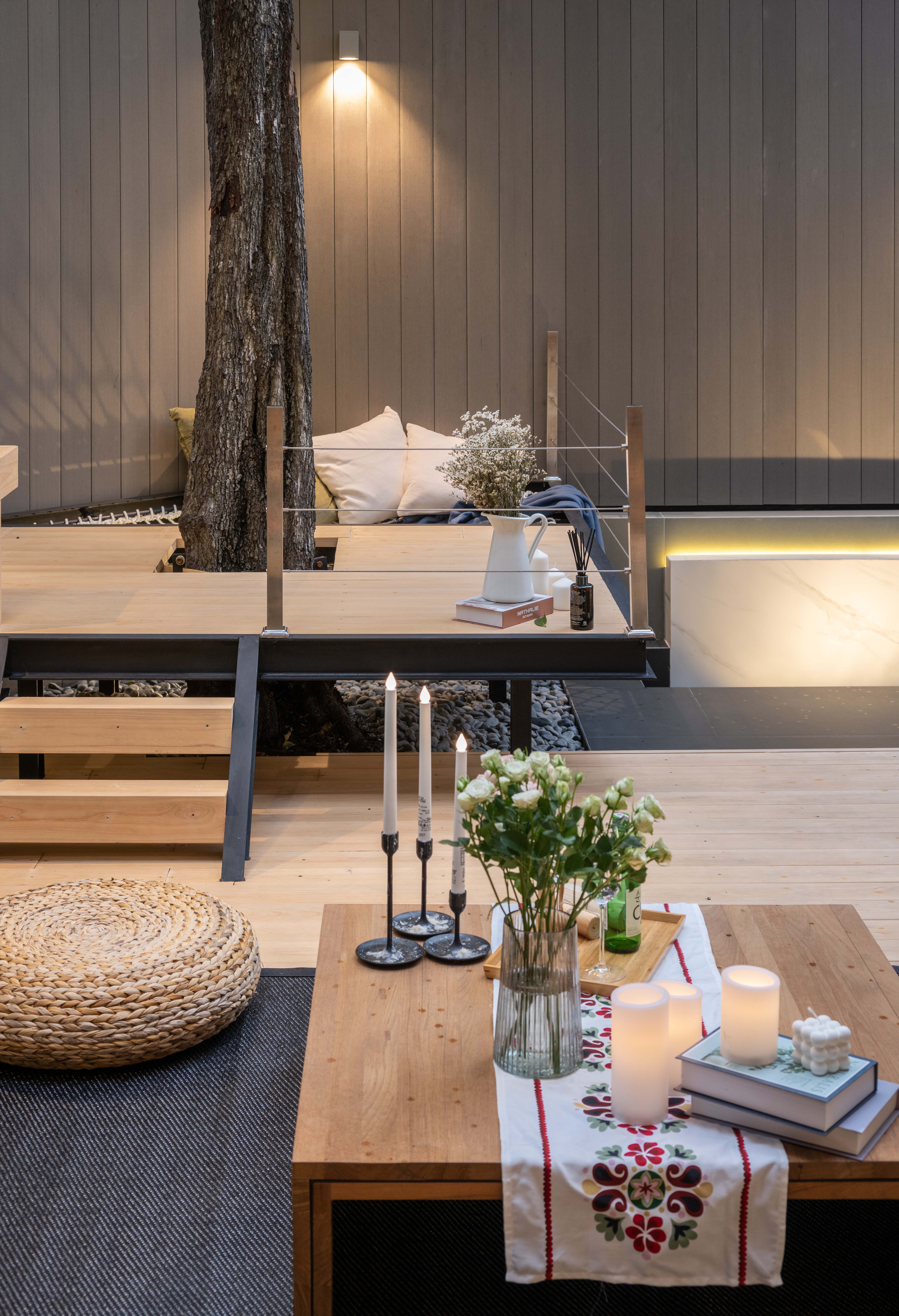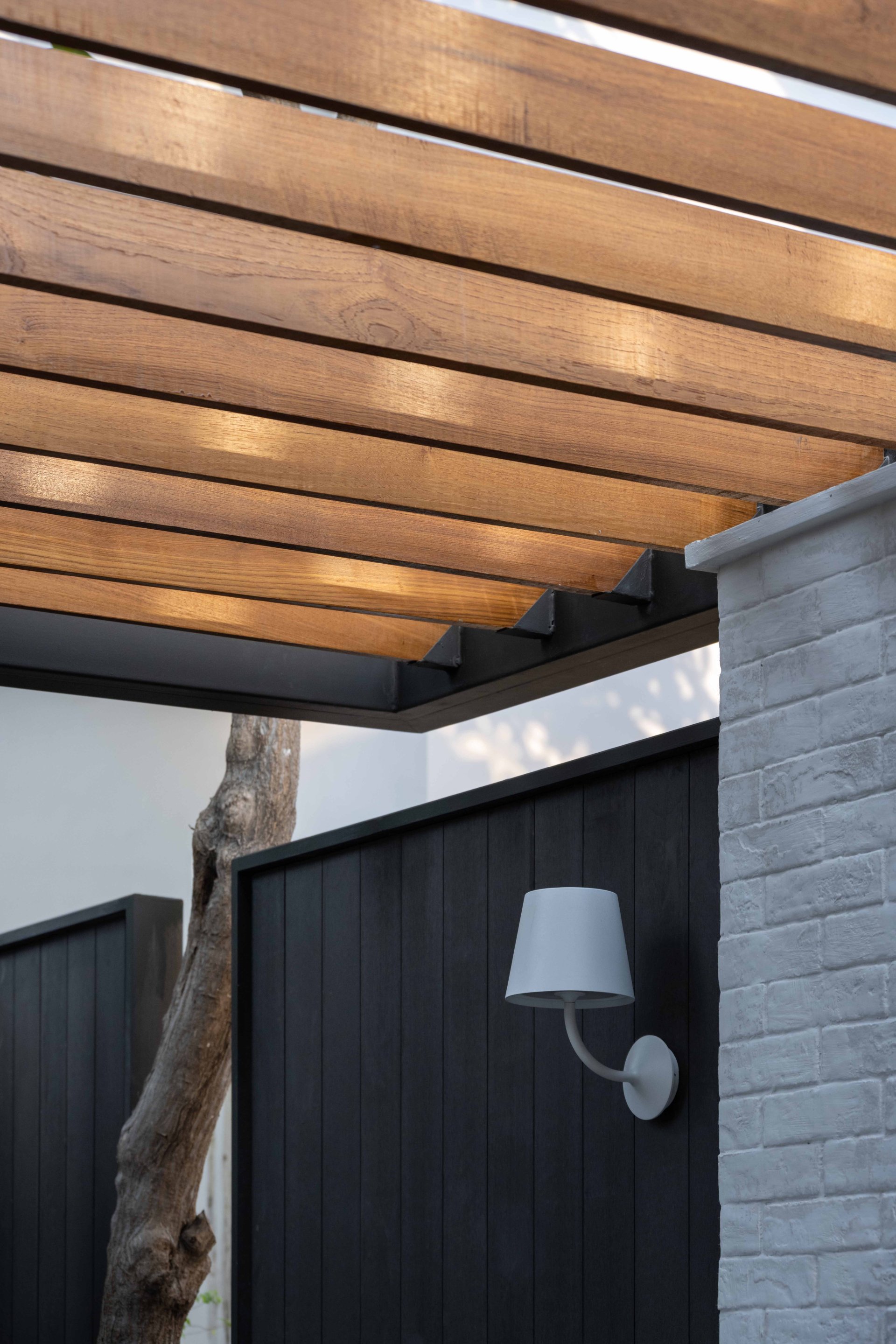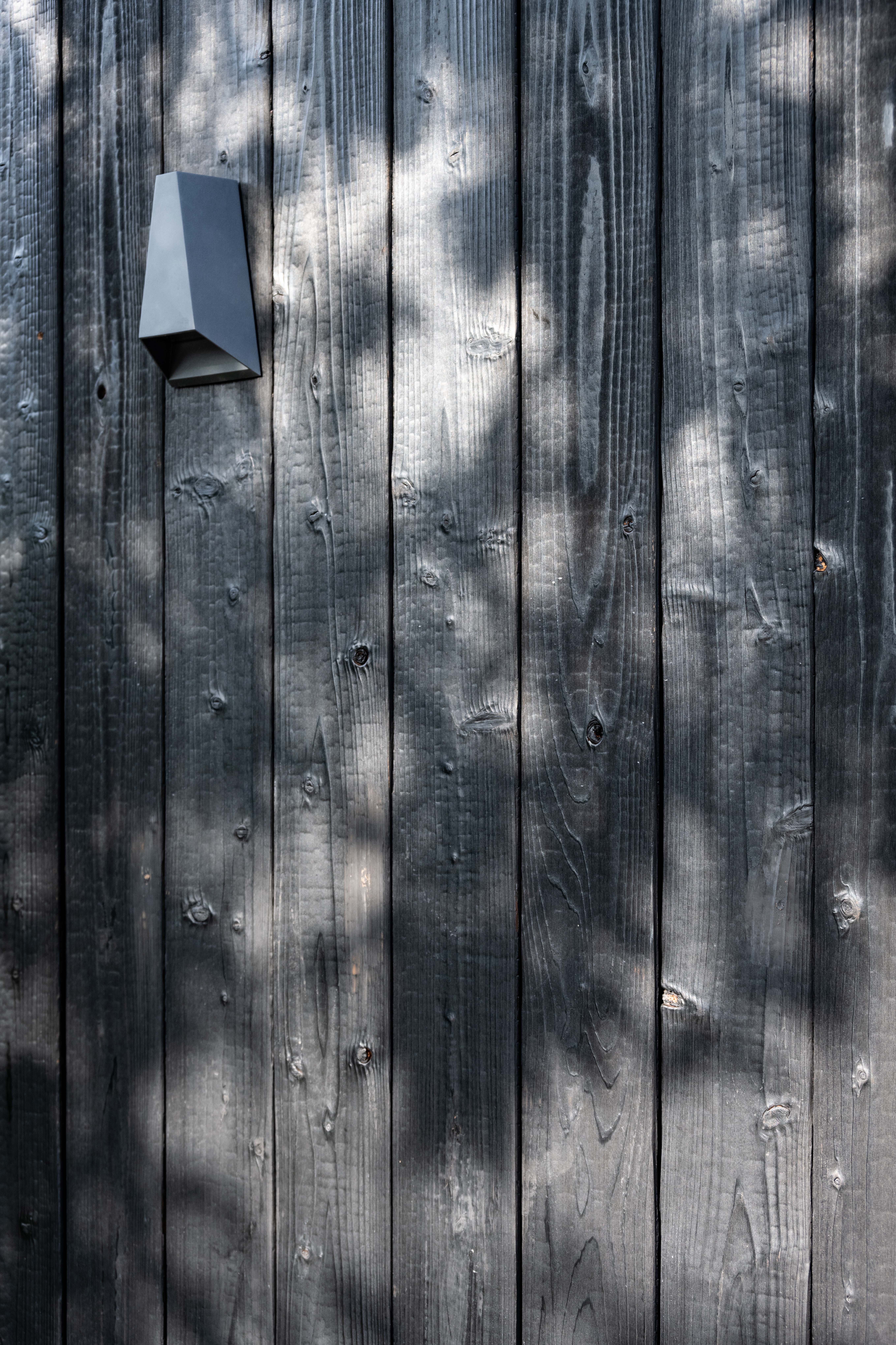 การใช้ไม้ช่วยลดความแข็งกระด้างของวัสดุ เพราะหากมีบางส่วนของบ้านที่ใช้อิฐอาจทำให้โทนส่วนนั้นดูแข็ง ในการตกแต่งบ้านให้มีความโมเดิร์นนั้น ส่วนสำคัญ คือ เส้นสายตรง เรียบง่าย รายละเอียดน้อย ดึงความเรียบง่ายนั้นออกมาได้ด้วยการซอยไม้เป็นแผ่นเล็ก ให้เห็นรอยต่อของไม้