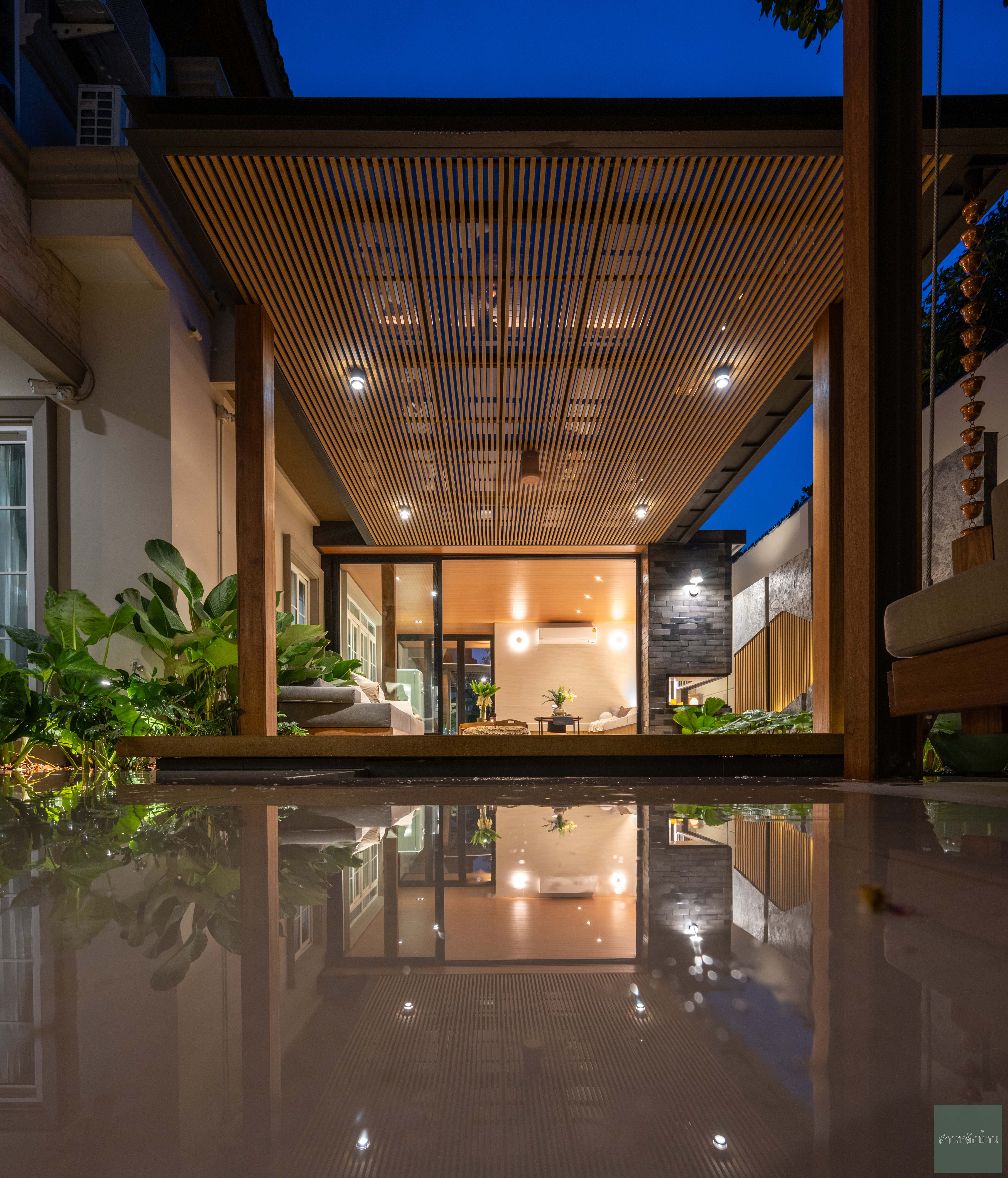 พื้นที่นั่งในชายคา ไว้นั่งมองเม็ดฝนที่โปรยลงบนใบไม้ อากาศสบายๆ ไว้นอนฟังเสียงฝน เป็นอีกมุมมองนึงที่เราได้มีโอกาสถ่ายทอดออกมา เมื่อฝนตกจนชุ่มฉ่ำ สวนนี้จึงผลิบาน.